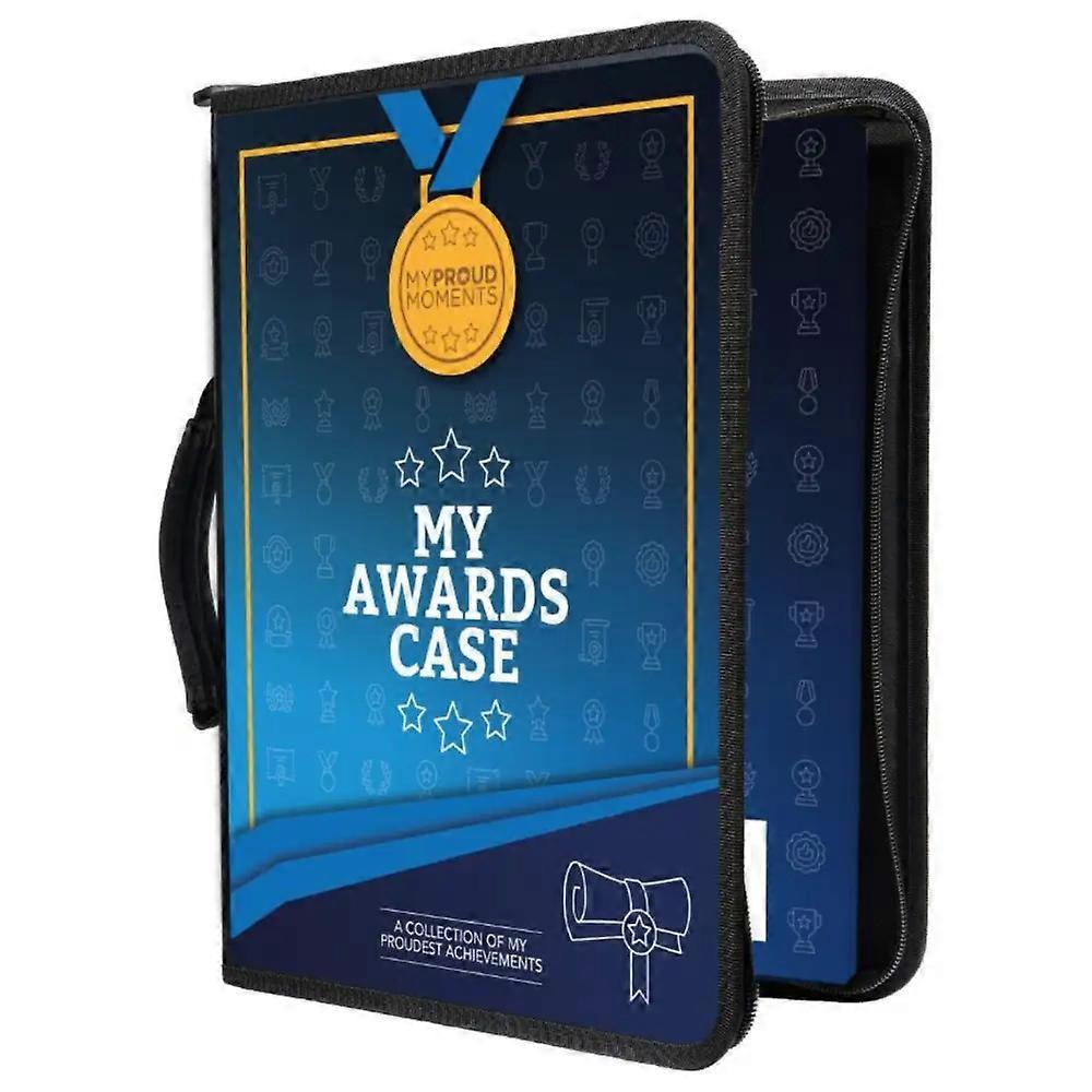 FEATURES Introduction Page - Front page to write their name and display photographs. Instruction Page - Guide for How to Display your Medals or Badges. Two Medal Sleeves - Display 16 Medals. Two Badge Sleeves - Display 24 Badges. Eight Certificate Holders - Display A4 or A5 certificates, to be mounted on. Two Scrapbook Pages - Pages for children to display photographs. Internal Pocket - Additional storage for Glue Dots, photographs, progress reports, etc. Case Dimensions - L 34.5cm x W 28cm / 1.4kg Microfibre case with padded carry handle Fully zipped for security The Blue Awards Case is a universal awards case in a classic navy-blue theme, perfect for displaying all kinds of awards and achievements, from your children's academic or sporting achievements to any other hobbies, afterschool clubs and activities they’ve taken part in. With eight certificate holders suitable for mounting up to 16 A4 or 32 A5 certificates, four PVC sleeves to display up to 16 medals and 24 badges, plus two scrapbook or photo pages, this case has plenty of room to protect their precious memories