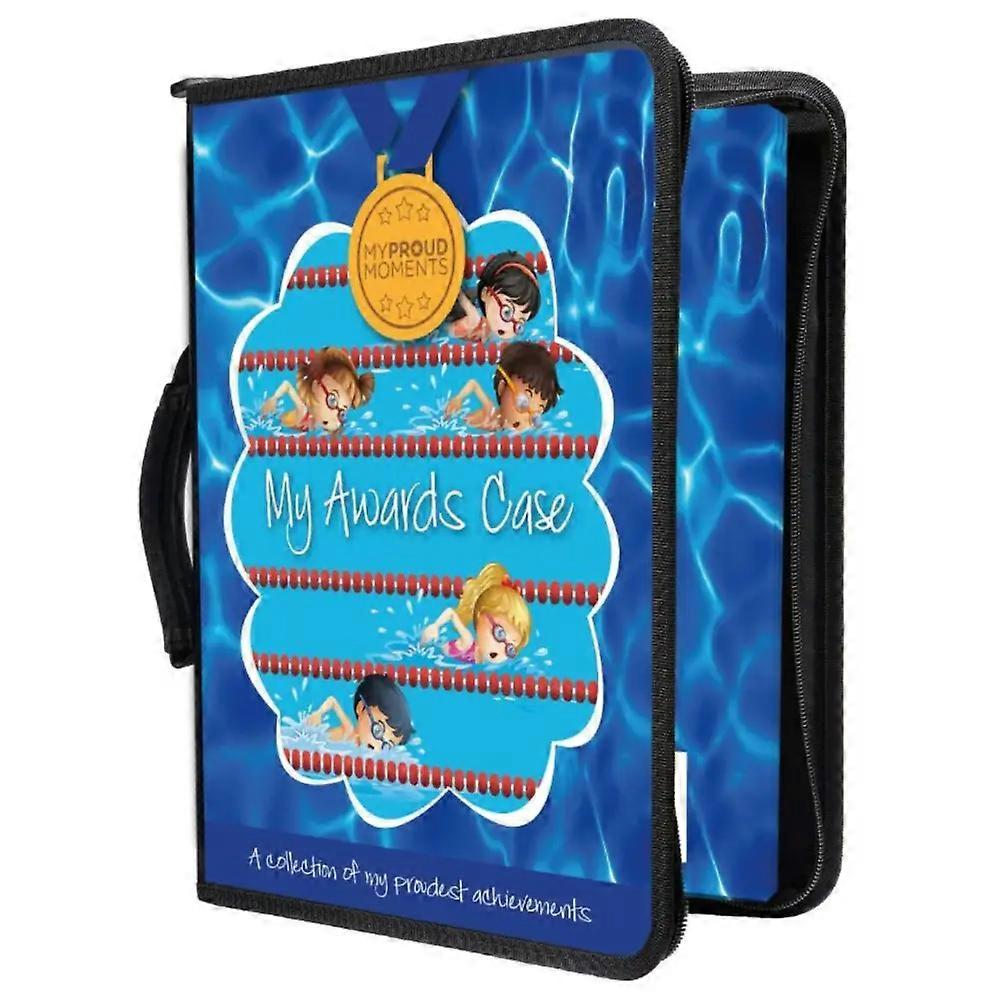 FEATURES Introduction Page - Front page to write their name and display photographs. Instruction Page - Guide for How to Display your Medals or Badges. Two Medal Sleeves - Display 16 Medals. Two Badge Sleeves - Display 24 Badges. Eight Certificate Holders - Display A4 or A5 certificates, to be mounted on. Two Scrapbook Pages - Pages for children to display photographs. Internal Pocket - Additional storage for Glue Dots, photographs, reports, etc. Case Dimensions - L 34.5cm x W 28cm / 1.4kg Microfibre case with padded carry handle Fully zipped for security The Swimming Awards Case is designed to make a splash. Swimming is a fun activity that many children love taking part in, so what better way to recognise their achievements than a swimming awards case