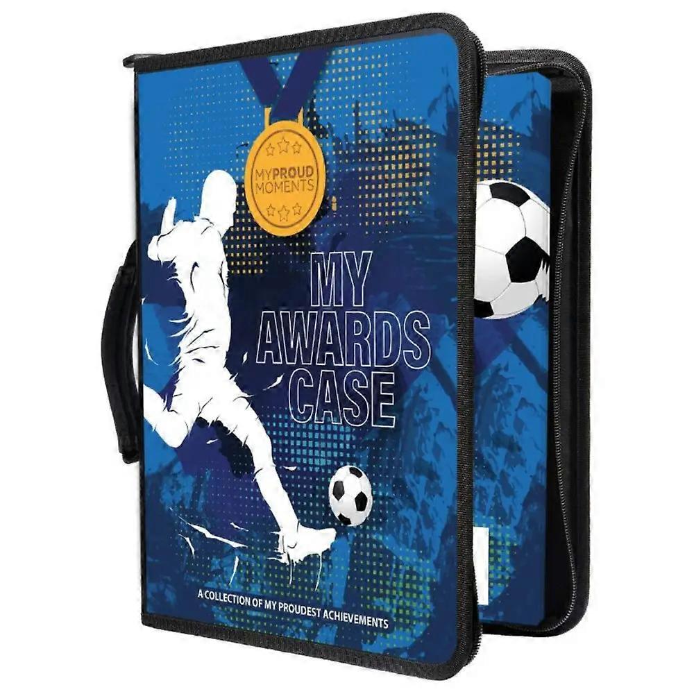 FEATURES Introduction Page - Front page to write their name and display photographs. Instruction Page - Guide for How to Display your Medals or Badges. Three Medal Sleeves - Display 24 Medals. Eight Certificate Holders - Display A4 or A5 certificates, to be mounted on. Three Scrapbook Pages - Pages for children to display photographs. Internal Pocket - Additional storage for Glue Dots, photographs, progress reports, etc. Case Dimensions - L 34.5cm x W 28cm / 1.4kg Microfibre case with padded carry handle Fully zipped for security The Football Awards Case is a cool, sporty case in a classic navy-blue theme, perfect for any football fan looking to display all of their sporting achievements With 3 PVC sleeves to display up to 24 medals and 8 certificate holder pages suitable for mounting A4 or A5 certificates, this case has plenty of room to protect their precious memories. These achievement cases make a great gift for any child by providing a fun way to display their well-deserved medals, badges and certificates. Made from a high-quality microfibre outer case with a padded carry handle and paired with a zip to ensure everything stays safely inside the case, your children will be thrilled to show off their proud moments at school, friends' or grandparents' houses for those precious "show and tell" occasions. Actual size of the case: L 34.5cm x W 28cm x H 4cm
