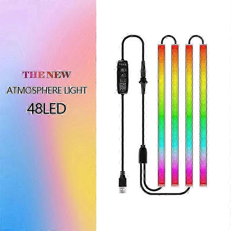 LED internal integration with high-quality external control single-line serial cascade constant current ICThe controller has two independent control buttons,which can control the flickering and changing of lights according to the rhythm of music,and can change 17 stream light modesThe ZENGGE application can control 10 fixed modes,100 built-in modes,and can DIY multiple favorite modesBuilt-in music mode,which can change the rhythm of the lights through music,DIY your favorite fixed color mode,and view the colors of the lights through the cameraAdjustable light brightness/speed,adjustable delay on/off lights,timed on/off lights,and on/off lights at any timeEquipped with a 2.4G-28 key remote control,no need for alignment,wall control,can control the light body within a range of 10 meters,and can change the brightness/speed7 static monochrome transformations can be switched,with one light three color static fixation,one light seven color static fixation,free light cycle switching,rainbow seven color streamer,seven color building blocks stacked,flowing color change from the middle to both sides,and flowing color change from both sides to the middle100 built-in mode switching,left and right meteor switching,left and right horse running switching,capable of recording 4 scene modes and switching 4 music modesIt can be set to turn off at a fixed time after 30 minutes to 1 hour,and the lights can be turned on/off at any timeSpecification:Material: PVC+LEDVoltage: 5VPower: 48 lights -9.6WNumber of light strips: 48 lamps -4 lampsx22cmNumber of LEDs: 48 LEDsLED type: SMD5050Wire length: 1.3Mx2+1.8Mx2Packaging size 48 lamp-250x60x60mmIllumination angle: 180 degrees wide angle illuminationLight strip color: transparent brushedRemote control: 1 RF remote control with 28 buttonsLight color: Phantom streamer,red,green,blue,white,orange,lime green,ice blue,purpleProduct certification: CE/ROHS/FCC/PSE/MSDS/SDS/ULApplicable socket: USBScope of application: Car mounted,TV background,computer host,bedside decoration,holiday decoration,etcControl method: application+buttonsControl principle: Bluetooth-compatible 4.0APP software type: LEDBLEFor iPhone: The device requires iOS 8.0 or higher.For iPad: The device must be equipped with iPadOS 8.0 or higher.For iPod touch: The device needs to be equipped with iOS 8.0 or higher.For Mac: requires macOS 11.0 or higher and a Mac with Apple M1 or higher chips.Installation:Tear off the double-sided tape on the back of the light strip,fix it in your preferred position,plug in a cigarette lighter or USB,turn on the power,and enjoy the lightPackage included:4 x 12LED Light Strips2 x 1.3m Wires2 x 1.8m Wires1 x Bluetooth-compatible+Button Remote Control1 x 28 Key Remote Control1 x USB Power2 x Adhesive Aids1 x English User Manual