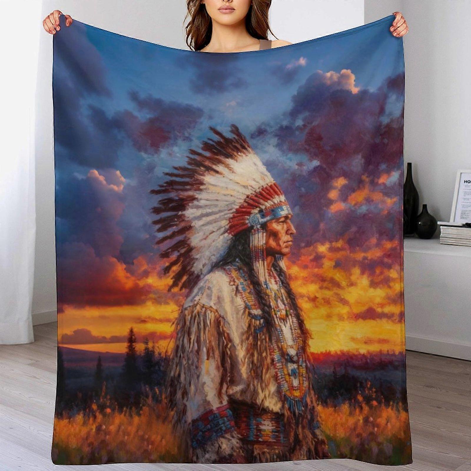 Native American Chief Dusk Landscape Print Flannel Blanket - Cozy Warm Throw | Rustic Art Decor for Living Room
