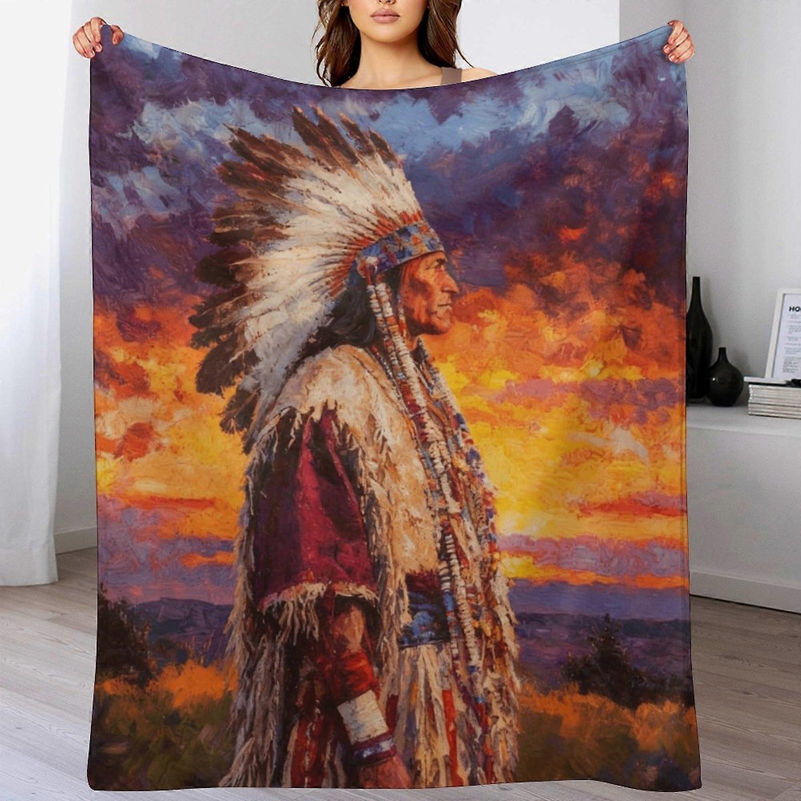 Native American Chief Sunset Print Flannel Blanket - Cozy Warm Throw | Cultural Art Decor for Home