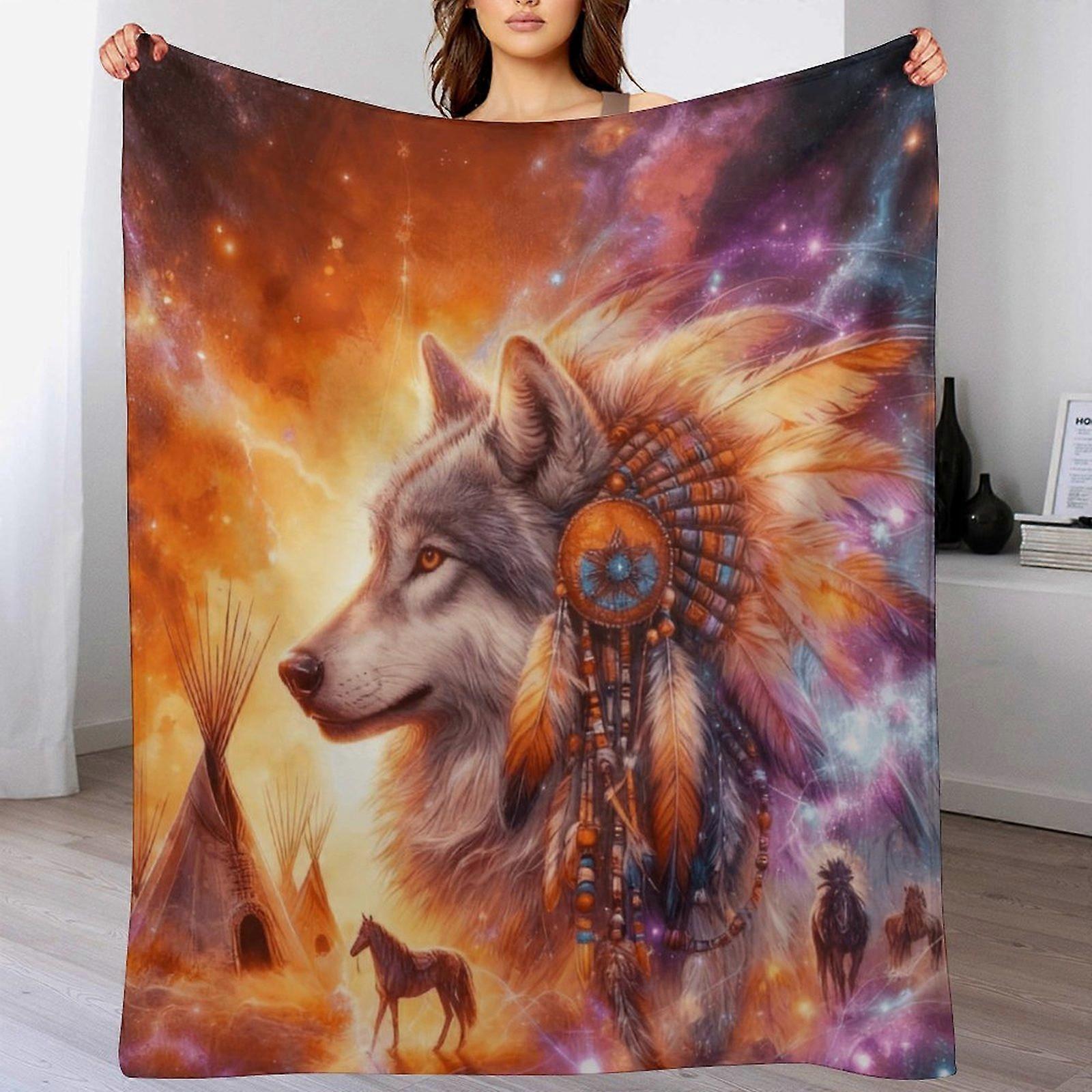 Native American Decor Wolf & Starry Sky Print Flannel Blanket - Cozy Warm Throw | Cultural Art Decor for Adults