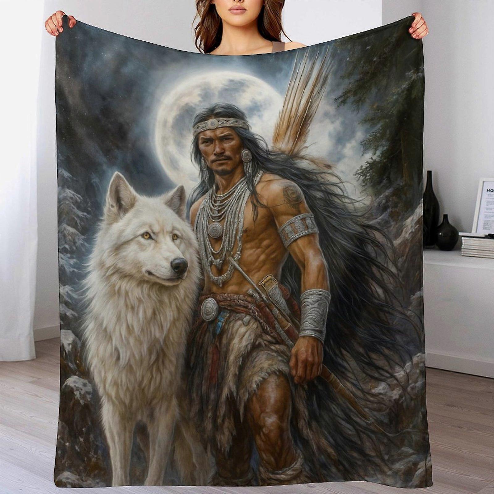 Native American Warrior & White Wolf Print Flannel Blanket - Soft Warm Throw for Living Room | Cultural Art Decor for Adults