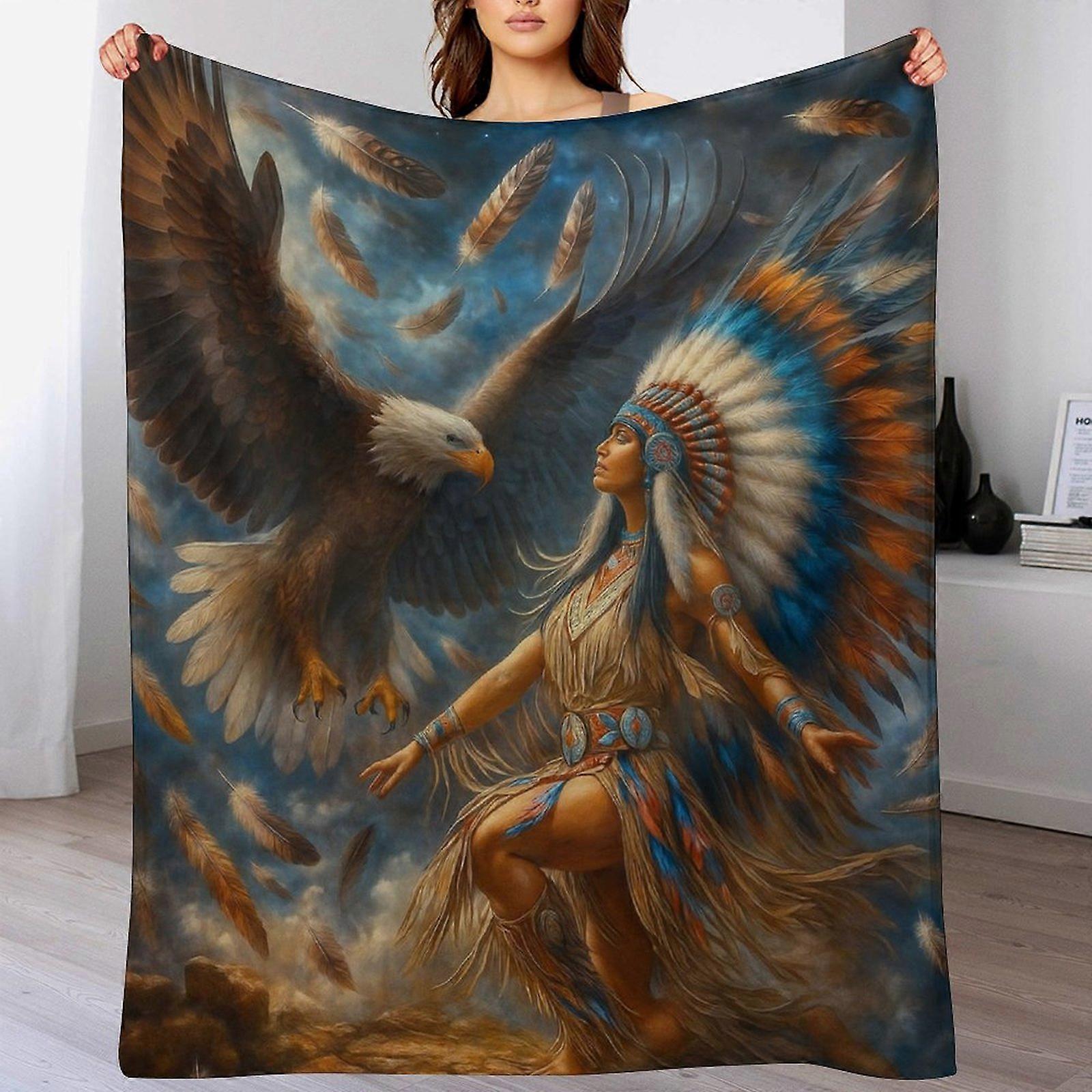 Native American Woman & Eagle Print Flannel Blanket - Soft Warm Throw | Cultural Art Decor for Adults