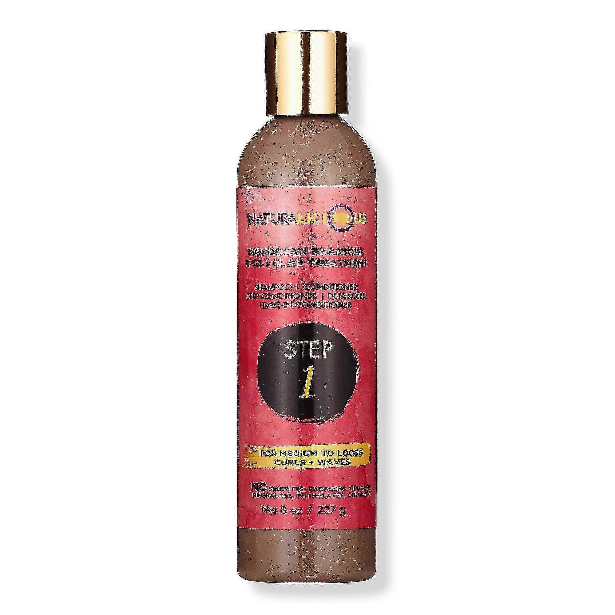 Created with mega-hydrating rhassoul clay, Naturalicious Moroccan Rhassoul 5-in-1 Clay Treatment effortlessly replaces 5 products in your hair regimen. This ''no-suds'' cleansing clay treatment is rich in silica, magnesium, potassium, and calcium, and removes excess toxins, impurities, and buildup.BenefitsIt works as a detoxifying cleanser, smoothing conditioner, effortless detangler and deep conditioner - all while also doing the work of a leave-in-conditionerWith cocoa butter & olive oil to help condition and soften hair as you cleanseSuggested Use: Shake well before using. Wet hair thoroughly, then apply a generous amount onto hair. Coat all of hair evenly with product. Massage onto hair and scalp, then gently detangle. Rinse out and apply Naturalicious Moisture Infusion Styling Creme (Step 2) to moisturize and style.Expiration Date: We have fresh stock each week with exceptional expiration dates prior to APRIL 2024. Products will expire no later than six months to 1 year after receipt.Product Packaging: Please note that some manufacturer may often change their packaging. This product may arrive different from what is pictured. We will always ship the most up-to-date packaging to our customers. Please contact us if you have any questions about this product or would like to request an older version of this product.Healthcare Disclaimer: Content on this site is for reference purposes only. OTC Shoppe Express does not represent or warrant that the nutrition, ingredient, allergen and other product information on our Web or Mobile sites are accurate or complete, since this information comes from the product manufacturers. On occasion, manufacturers may improve or change their product formulas and update their labels. We recommend that you do not rely solely on the information presented on our Web or Mobile sites and that you review the product's label or contact the manufacturer directly if you have specific product concerns or questions. If you have specific healthcare concerns or questions about the products displayed, please contact your licensed healthcare professional for advice or answers.