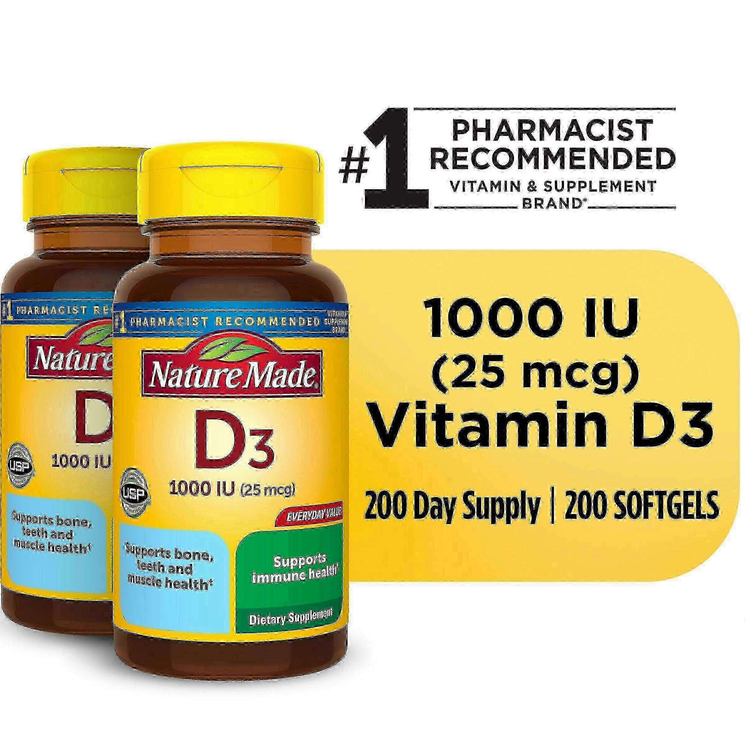 Say hello to an easy and effective Vitamin D supplement to support muscle, bone, teeth, and immune health. While sunshine is a great source of Vitamin D, many people arenât making enough of this essential nutrient from the sun. Vitamin D can be found in food as well in two different forms (known as Vitamin D2 and Vitamin D3), however, Vitamin D3 is more effective at raising and maintaining adequate levels of Vitamin D throughout the body. Vitamin D is a common nutrient shortfall. In fact, 95% of the US population does not get enough Vitamin D from food alone, making supplementation that much more important.(1) Support your sunshine and Vitamin D dietary needs today, with Nature Madeâs Vitamin D 1000 IU (25 mcg) softgels, 200 Count Twin Pack. (1)NHANES 2005-2016 Nutrients 2020, 12, 1735. (2)Based on a survey of pharmacists who recommend branded vitamin and supplements VITAMIN D3 IS ESSENTIAL TO A HEALTHY IMMUNE RESPONSE & MORE: Vitamin D is an essential nutrient that helps support a healthy immune response, aids in calcium absorption to support strong bones and teeth and supports muscle function. THE BODYâS PREFERRED FORM OF VITAMIN D: Vitamin D3 is more effective than Vitamin D2 at raising and maintaining adequate Vitamin D levels throughout the body. 200-DAY SUPPLY: 200 Count - Contains 200 softgels. Adults take 1 softgel daily with water and a meal. HIGH QUALITY INGREDIENTS: Made from carefully selected ingredients under strict manufacturing practices and guaranteed to meet our high quality standards. No color added. No artificial flavors. Gluten free.