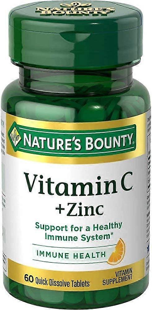 Natural citrus flavor Helps fight free radicals No artificial flavor Dietary SupplementSupports Immune System Health Natural Citrus Flavor Helps Fight Free Radicals No Artificial Flavor Nature's Bounty Quick Dissolve Vitamin C plus Zinc is a delicious way to support immune system health while supplying your body with its daily allowance of both nutrients. As an antioxidant, Vitamin C helps fight cell-damaging free radicals in the body, which can lead to oxidative stress and the premature aging of cells.No artificial flavor, no preservatives, no starch, no milk, no lactose, no soy, no gluten, no wheat, no yeast, no fish. Sodium free. Suitable for vegetarians. Suggested Use: For adults, take one (1) quick dissolve tablet daily, preferably with a meal. Place tablet under tongue for 30 seconds before swallowing. UPC: 074312553936 Weight: 0.57 lbs