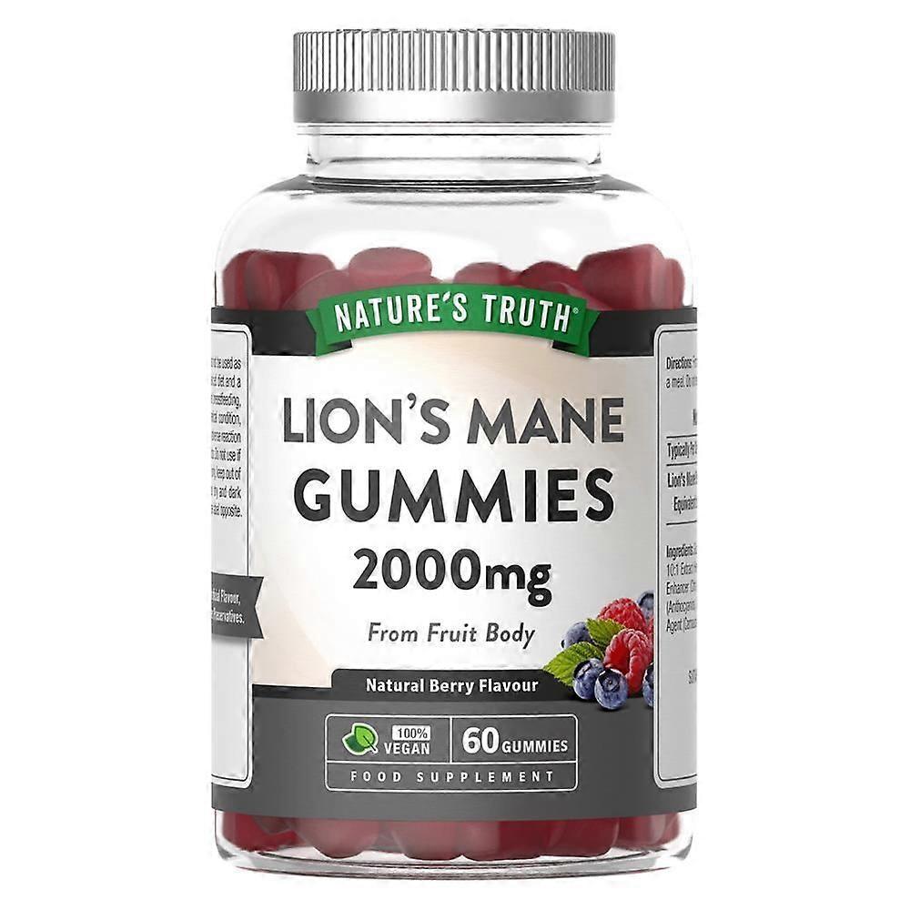 Experience natural cognitive support with Nature's Truth Lion's Mane Gummies. Each serving delivers 2000mg of potent Lion's Mane mushroom extract (Hericium erinaceus, 10:1 Fruit Body Extract) in a delicious berry-flavoured vegan gummy. Designed to promote brain health, memory, and mental clarity, these gummies provide a convenient and enjoyable way to enhance focus and cognitive function. Key Ingredients & Benefits Lion's Mane Mushroom Extract: Renowned for its neuro-supportive and adaptogenic properties, Lion's Mane helps support overall brain health, cognitive performance, memory retention, and mental clarity. Product Highlights Supports brain health and cognitive function Enhances mental clarity and focus naturally Delicious berry flavour for easy daily consumption Vegan-friendly and suitable for various dietary needs Dietary Information Dairy Free Gluten Free Vegan & Vegetarian Wheat Free Allergen Notice Contains coconut-derived ingredients. Please review the ingredient list carefully if you have allergies. Additional Information Packaging is 100% recyclable, reflecting a commitment to sustainability. Manufactured in the EU under GMP and BRC accredited standards, ensuring premium quality and safety. Incorporate Nature's Truth Lion's Mane Gummies into your daily wellness routine to naturally support your brain health and cognitive vitality with a convenient, tasty, and vegan-friendly supplement.