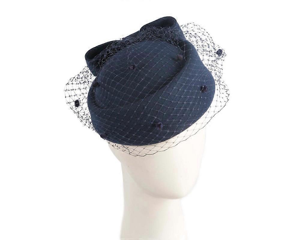 Large navy pillbox hat made form pure wool felt. This elegant fascinator hat has bow at the back and face veil for great look. Great choice for autumn and winter racing event or any special ocassion. Designed in Australia Legendary Max Alexander brand Pure wool felt Elastic band for easy wear