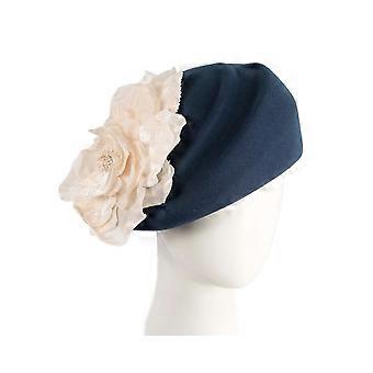 Navy Wool Hat with Cream Floral Accent - Winter Elegance F709NC