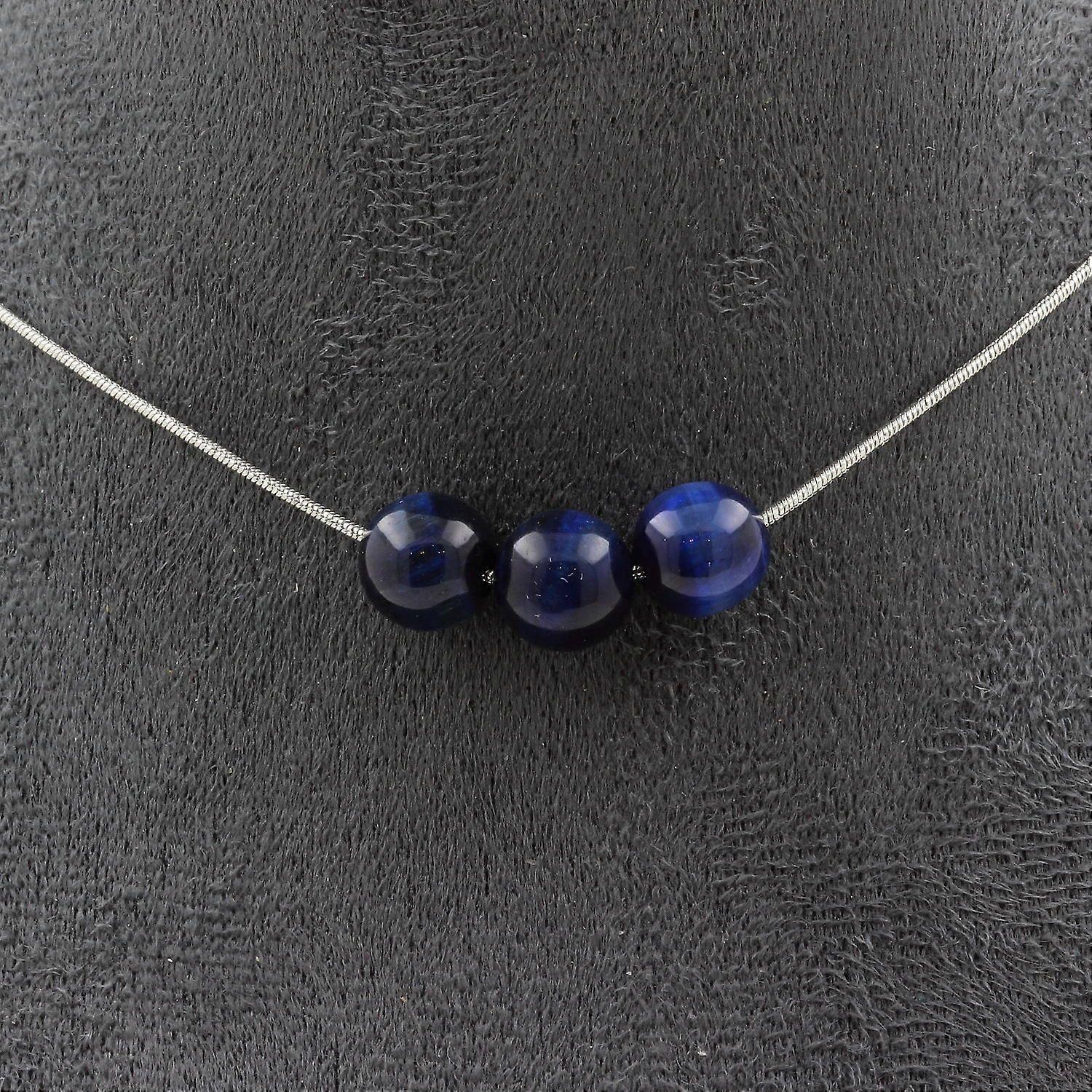 Necklace with 3 Blue Tiger Eye beads 8 mm, stainless steel chain, length 45 cm. Made in France in the A Bijoux workshop. Delivered in a box pouch. Necklace for women, men, children. Ref. : SKU055039_3. Jewelry worn around the neck, often made of precious metals or adorned with precious and semi-precious stones.