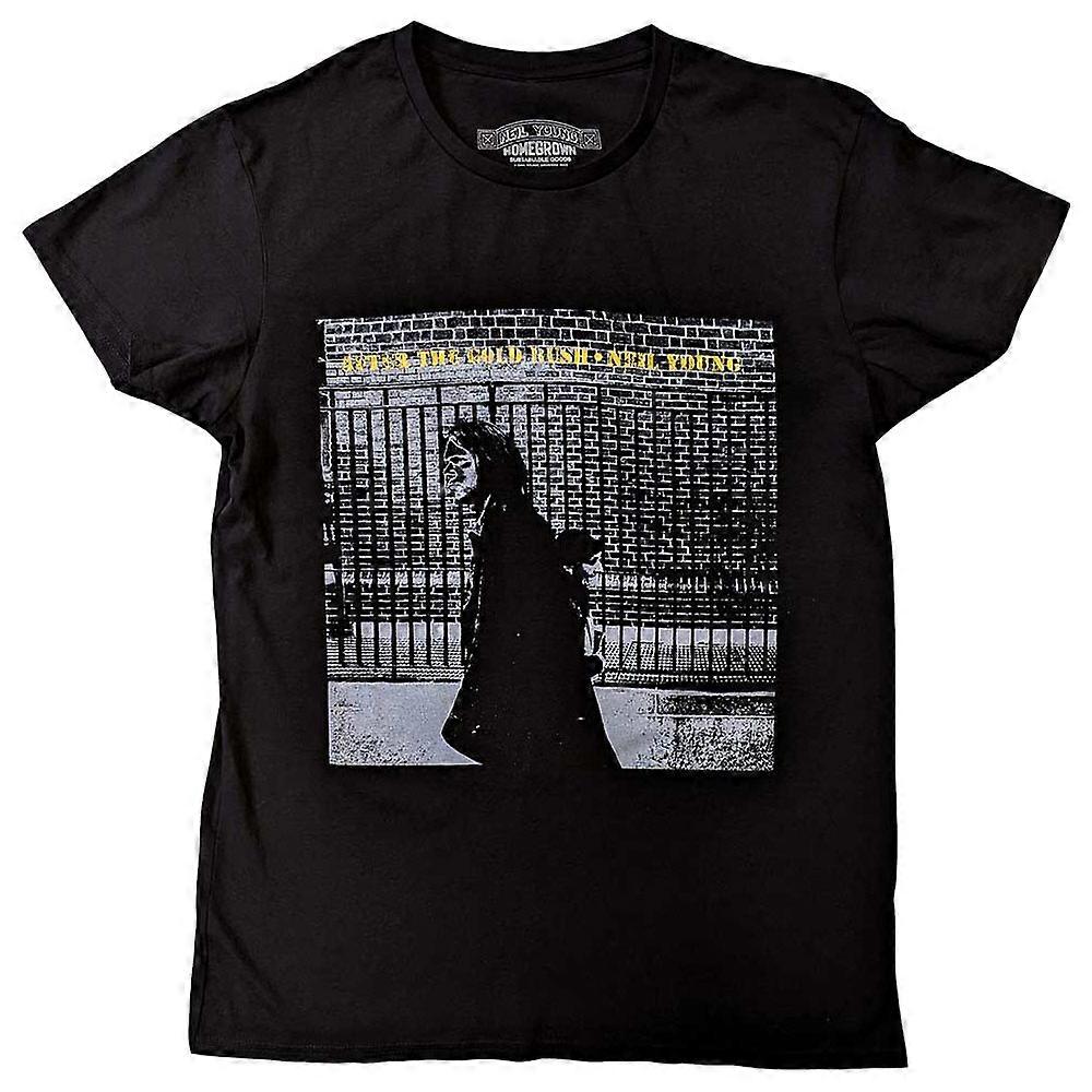 Official licensed Neil Young Unisex T-Shirt featuring the 'After The Gold Rush' design motif. High quality black unisex t-shirt featuring front printing. With gold coloured foil print detailing. Comes in a wide range of sizes from Small through XX-Large, subject to availability.