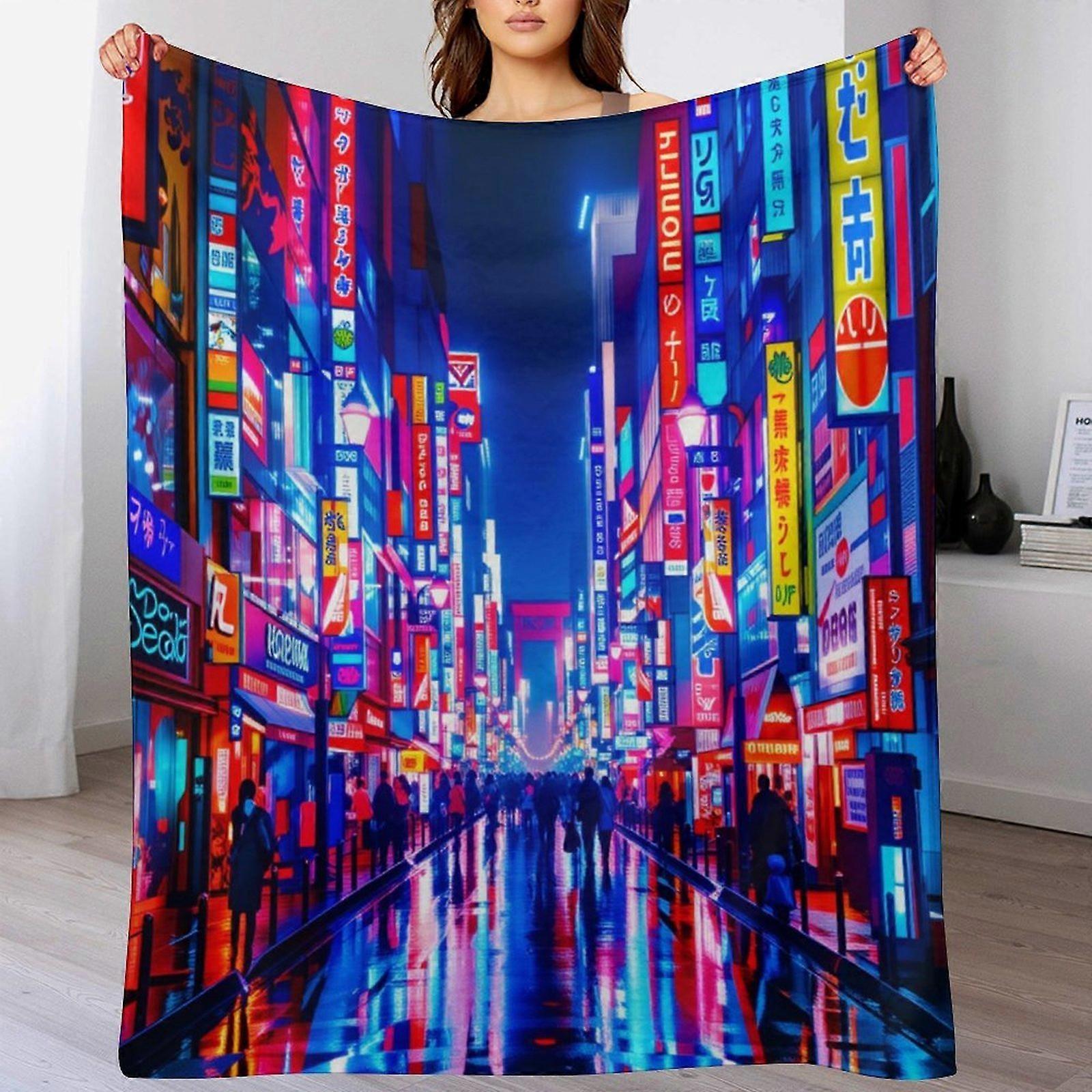 Neon Cyberpunk Tokyo Street Print Flannel Blanket - Cozy Warm Throw | Aesthetic Decor for Anime & City Lovers