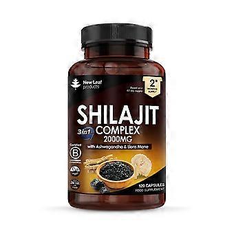 Dive into New Leafs' Shilajit Complex, offering 120 capsules per bottle for a two-month supply. Each serving provides 2000mg of Shilajit, with Ashwagandha root extract and Lion's Mane mushroom extract.