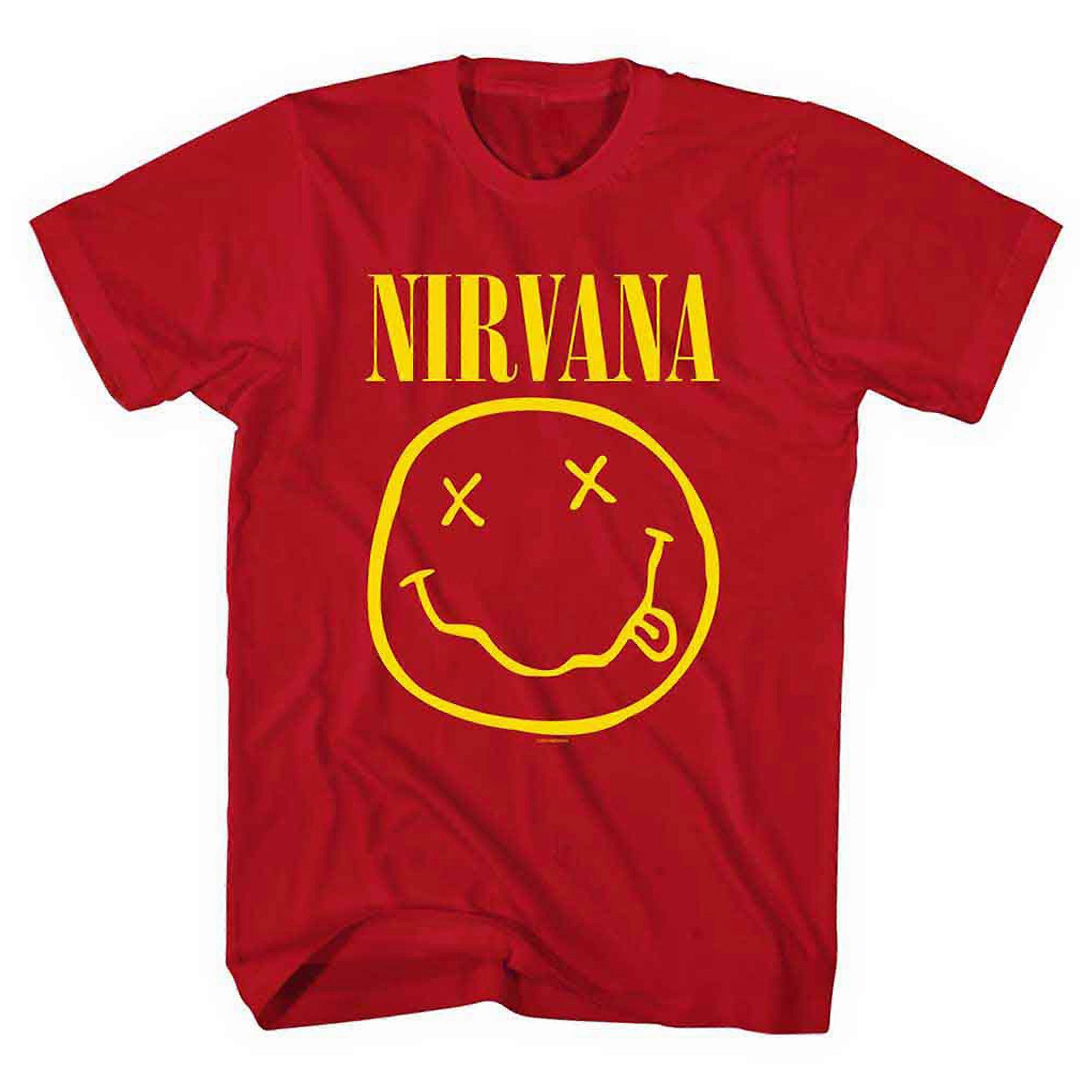 An official licensed Nirvana Unisex T-Shirt featuring the 'Yellow Grunge Smile' design motif. This high quality T-Shirt is available in a red colourway. Classic fit soft-style cotton tee with short sleeves and crew neck. Features front printing. Comes in a wide range of sizes from Small through XX-Large, subject to availability.