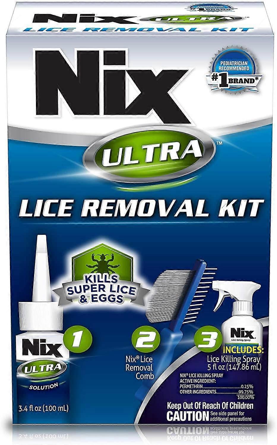 Nix out Super Lice. Nix Ultra 2-in-1 Super Lice Removal Kit kills head lice and eggs (nits), including hard-to-kill Super Lice. From the 1 pediatrician-recommended lice removal brand, this all-in-one kit effectively eliminates lice from heads and homes. Nix Ultra 2-in-1 Super Lice Treatment Solution is specifically designed to kill Super Lice, which have developed resistance to many traditional lice treatments. First, treat head hair with pesticide-free Nix Ultra 2-in-1 Super Lice Treatment Solution that's tough on lice, but gentle on skin. Then, remove lice and eggs (nits) from head hair with the Nix Premium Metal 2-Sided Lice Removal Comb. The two-sided comb features wide teeth that are set wider apart to help detangle hair and smaller teeth that are set closer together to assist in the removal of lice and eggs (nits). Finally, effectively rid your house of lice (and dreaded bed bugs ) for up to four weeks with odorless and stainless Nix Lice & Bed Bug Killing Spray for Home. Nix Ultra 2-in-1 Super Lice Treatment Solution is for use on head hair and is safe for use on children two years and older. Nix Lice & Bed Bug Killing Spray for Home is for use on bedding and furniture and is not for use on humans. Nix is trusted by moms and feared by lice. See the package insert for full instructions and read entire label before each use. Spanish instructions included. Nix out Super Lice with the Nix Ultra 2-in-1 Super Lice Removal Kit. Nix 2-in-1 Ultra Super Lice Removal Kit: Lice removal treatment for hair and home Kills lice and eggs (nits), including hard-to-kill Super Lice Fast, effective, non-toxic and pesticide-free Tough on lice and gentle on skin Nix Ultra 2-in-1 Super Lice Treatment Solution is for use on head hair and is safe for use on children 2 years and older Nix Premium Metal 2-Sided Lice Removal Comb effectively removes lice and eggs (nits) from hair after treatment with both a wide tooth side for detangling hair and a fine tooth side for removal Nix Lice & Bed Bug Killing Spray for Home kills lice and bed bugs on furniture and bedding, is effective for up to 4 weeks, has no odor, is non-staining and leaves no sticky residue. Not for use on humans, read entire label before each use Nix Ultra Super Lice Removal Kit contains: 1 bottle of Nix Ultra 2-in-1 Super Lice Treatment Solution, 3.4 fl oz; 1 Nix Premium Metal 2-Sided Lice Removal Comb and 1 bottle of Nix Lice & Bed Bug Killing Spray for Home, 5 fl oz UPC: 363736000189 Weight: 1.13 lbs
