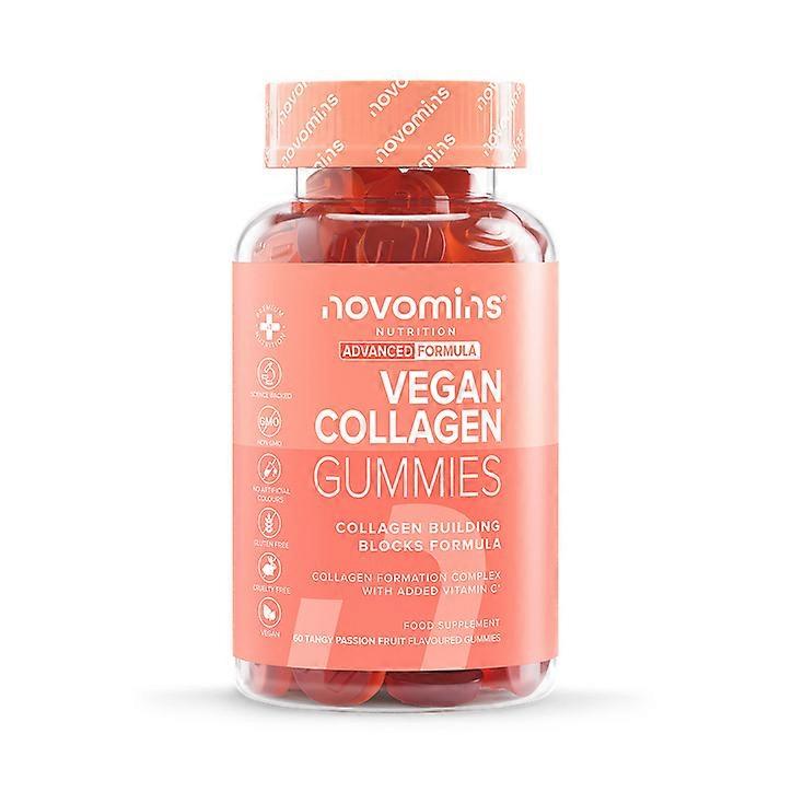 Passionfruit-flavoured Vegan Collagen Gummies Food Supplement * SKIN & COLLAGEN SUPPORT: Vitamin C contributes to normal collagen formation for the normal function of skin * HAIR & NAIL HEALTH: Zinc contributes to the maintenance of normal hair and nails Designed to help you, our expert-formulated gummies contain plant-based ingredients, zinc, vitamin C, and amino acids to support skin, hair, nails. With a delicious tangy passion fruit flavour, they’re perfect for those following a vegan lifestyle. Gluten-free, gelatine-free, and free from artificial additives, these gummies are a great addition to your daily health and beauty routine. Novomins is a health and wellness brand focused on providing high-quality, science-backed vitamins designed to enhance health and happiness. Their product range is developed by a team of doctors, pharmacologists, neuroscientists and nutritionist who prioritise both taste and effectiveness. Novomins emphasises the importance of using premium quality ingredients, ensuring that all their products are manufactured in facilities that adhere to strict manufacturing standards. Their facilities undergo regular, comprehensive inspections, and each product is third-party tested. With a commitment to transparency, Novomins ensures that their products are free from harmful additives and are suitable for various dietary requirements. Novomins places a strong emphasis on sustainability and ethical business practices, aligning with its certification as a B Corporation. Ingredients: INGREDIENTS: Glucose Syrup, Sugar, Pectin, Acidity Regulators (Sodium Citrate, Citric Acid), Vitamin C (Ascorbic Acid), Bamboo Extract, Coconut Oil, Branched Chain Amino Acids (BCAA’s), Hyaluronic Acid, Vitamin E (as DL-Alpha-Tocopheryl Acetate), Natural Passion Fruit Flavour, Glazing Agent (Vegetable Oil(Sunower Seed Oil) (contains Carnauba Wax)), Lysine, Phenylalanine, Histidine, L-Tryptophan, Zinc (Zinc Citrate), Purple Carrot Juice Concentrate, Niacin (as Nicotinamide), Vitamin D2 (as Ergocalciferol) Always read the label before use Advisory Information: Do not exceed the recommended daily dose. Food supplements must not be used as a substitute for a varied and balanced diet and a healthy lifestyle. If you are pregnant, nursing or taking any medication or are under medical supervision, please consult your doctor or a medical professional before use. Discontinue use and contact a doctor immediately if any adverse reactions occur. Gummies are intended to be chewed and not swallowed whole. This product is suitable for vegetarians. Remember To: We go to great efforts to ensure that the information on this page is accurate at the time that the page was last edited. As we are constantly reviewing and developing our products to meet our consumer needs, consumers, particularly those that suffer from allergies and intolerances, should always check product labelling, warnings, and directions provided with the product that is delivered, prior to use or consumption. Directions: FOR BEST BEFORE END/LOT, PLEASE SEE BASE. Chew 2 gummies daily for optimal results, or as directed by your healthcare professional. Nutritional Information: Per Serving: Vitamin C 50mg BCAA 20 mg Vitamin D2 20 IU 10% Vitamin E 20 IU 112% Niacin 5 mg 31% Zinc 3 mg 30% Hyaluronic Acid 20 mg Lysine 10 mg Bamboo Extract 50 mg L-Phenylalaline 10 mg L-Histidine 10 mg L-Tryptophan 10 mg
