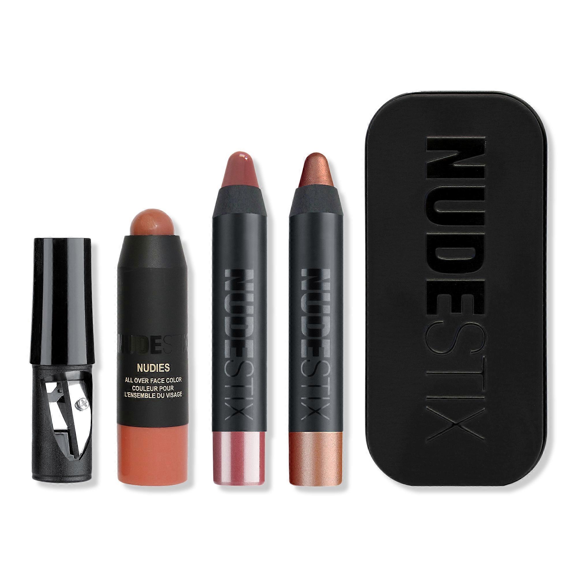 NUDESTIX Sunkissed Nudes Mini 3-Piece Kit is a versatile collection designed to enhance your natural look with ease. This set includes three mini-sized products: Nudies Matte Blush for multi-purpose use on eyes, cheeks, and lips, Magnetic Luminous Eye Color for a touch of shimmer on the eyes, and Gel Color Lip + Cheek Balm for a glossy finish. Perfect for achieving a bronzed, luminous, and fresh-faced appearance, this kit is ideal for on-the-go use. Ingredients Nudies Matte Blush and Bronze: Dimethicone Crosspolymer, Kaolin, Aluminum Starch Octenylsuccinate, C12-15 Alkyl Benzoate, Tocopheryl Acetate, Silica, Caprylyl Glycol, Pentaerythrityl Tetra-Di-T-Butylhydroxyhydrocinnamate, Hexylene Glycol, Phenoxyethanol. May Contain: Titanium Dioxide (CI 77891), Iron Oxides (CI 77491, CI 77492, CI 77499). Magnetic Luminous Eye Color: Isododecane, Cyclopentasiloxane, PEG/PPG 19/19 Dimethicone, Synthetic Wax, Hydrogenated Polydicyclopentadiene, Nylon-12, C20-40 Alcohol, Perfluorononyl Dimethicone, Polyglyceryl-4diisostearate/Polyhydroxystearate/Sebacate, Polyethylene, Dimethicone/Vinyl Dimethicone Copolymer, Pentaerythrityl Tetra-Di-T-Butyl Hydroxyhydrocinnamate, Silica, Isoceteth-10, Tocopherol. May Contain: Mica, Titanium Dioxide (CI 77891), Iron Oxides (CI 77491, CI 77492), Ferric Ferrocyanide. Gel Color Lip + Cheek Balm: Bis-Behenyl/Isostearyl/Phytosteryl Dimer Dilinoleyl Dimer Dilinoleate, Isocetyl Stearate, Diisostearyl Malate, Polybutene, Synthetic Wax, Silica, Synthetic Beeswax, Glyceryl Caprylate, Pentaerythrityl Tetra-Di-T-Butyl Hydroxyhydrocinnamate, Tocopherol, Tin Oxide. May Contain: Titanium Dioxide (CI 77891), Iron Oxides (CI 77491), Blue 1 (CI 42090), Red 6 (CI 15850), Red 7 (CI 15850), Red 21 (CI 45380), Red 28 (CI 45410), Red 30 (CI 73360), Yellow 5 (CI 19140), Yellow 6 (CI 15985), Manganese Violet (CI 77742). Suggested Use> Nudies Matte Blush: Swipe onto eyes, cheeks, or lips and blend with a brush or fingers for a natural, multi-purpose touch of color. Magnetic Luminous Eye Color: Apply directly to the eyelids for a shimmery, long-lasting finish. Gel Color Lip + Cheek Balm: Use on lips or cheeks for a glossy, hydrated glow.