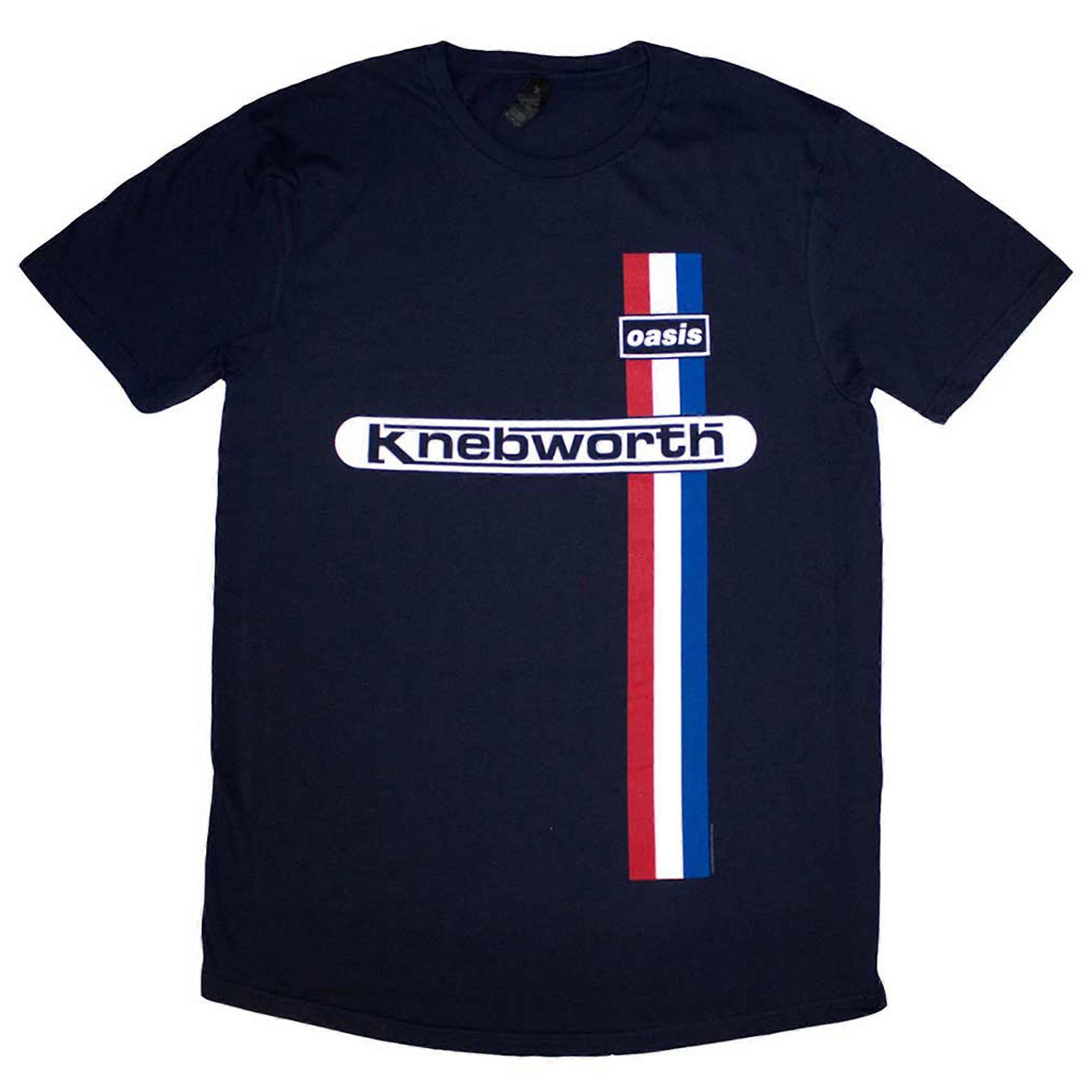 Official licensed Oasis Unisex T-Shirt featuring the 'Knebworth Vertical Stripe' design motif. High quality T-Shirt available in a navy blue colourway. High quality soft-style cotton unisex t-shirt featuring front printing. Comes in a wide range of sizes from Small through XX-Large, subject to availability.