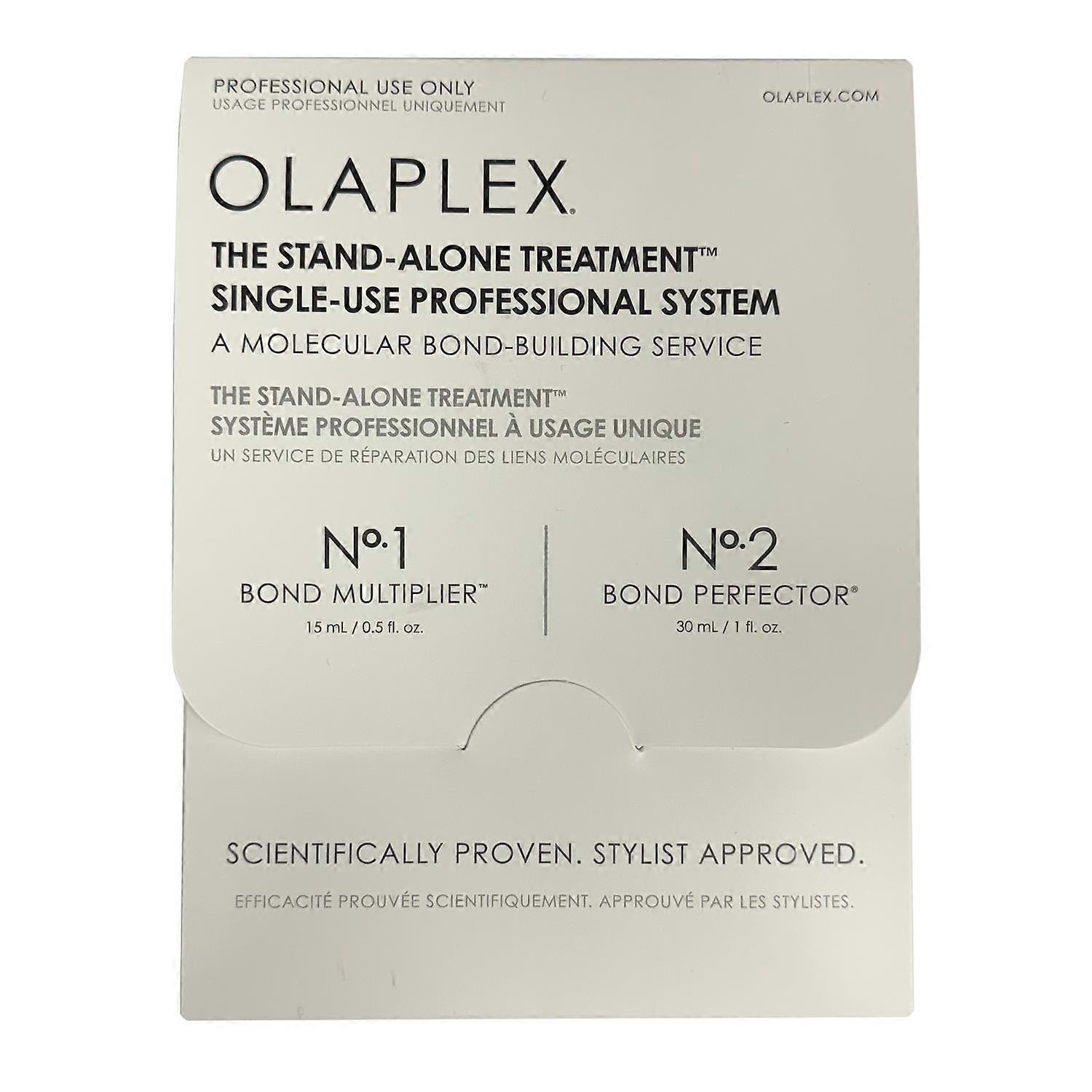 Olaplex The Stand-Alone Treatment is a professional bond-building service designed to help reverse hair damage caused by chemical services, heat styling and mechanical stress.This single-use professional system contains a high-strength concentration of Olaplex’s patented ingredient, Bis-Aminopropyl Diglycol Dimaleate, which is scientifically proven to help improve hair strength and integrity by relinking broken disulfide bonds.Who Is This For?This professional treatment is ideal for:All hair typesHair damaged by colouring or chemical servicesHeat-damaged or mechanically stressed hairProfessional salon useClients seeking intensive hair repairWhat Results to ExpectImmediate results:Stronger-feeling hairImproved hair integrityReduced appearance of damageWith regular use:Healthier-looking hair structureImproved resistance to breakageConsistently stronger, more resilient hairProduct DetailsProfessional single-use bond-building treatmentIncludes Olaplex Nº.1 Bond Multiplier 15ml sachetIncludes Olaplex Nº.2 Bond Perfector 30ml sachetDesigned as a stand-alone professional serviceHelps repair damage from chemical, heat and mechanical stressSuitable for all hair types and all levels of damageFAQIs this a professional-only treatment?Yes — this system is designed for professional salon use.How many applications does this contain?It contains a single application of the Olaplex Stand-Alone Treatment.What type of damage does it help repair?It helps address damage caused by chemical services, heat styling and mechanical friction.Is it suitable for all hair types?Yes — it’s suitable for all hair types and all levels of damage.How to use:STEP 11. Mix one packet (15 mL/ 0.5 fl. oz.) of N°1 BOND MULTIPLIER™ with 90mL / 3 fl. oz. of water in a nonspraying applicator bottle. 2. At the shampoo bowl, apply mixture to dry hair, saturating thoroughly. Process for 5 minutes. DO NOT RINSE.STEP 21. Apply one packet (30 mL / 1 fl. oz.) of Nº2 BOND PERFECTOR® from roots to ends. Leave on for a minimum of 10 minutes. 2. Rinse, shampoo, and condition. 3. Style as usual.