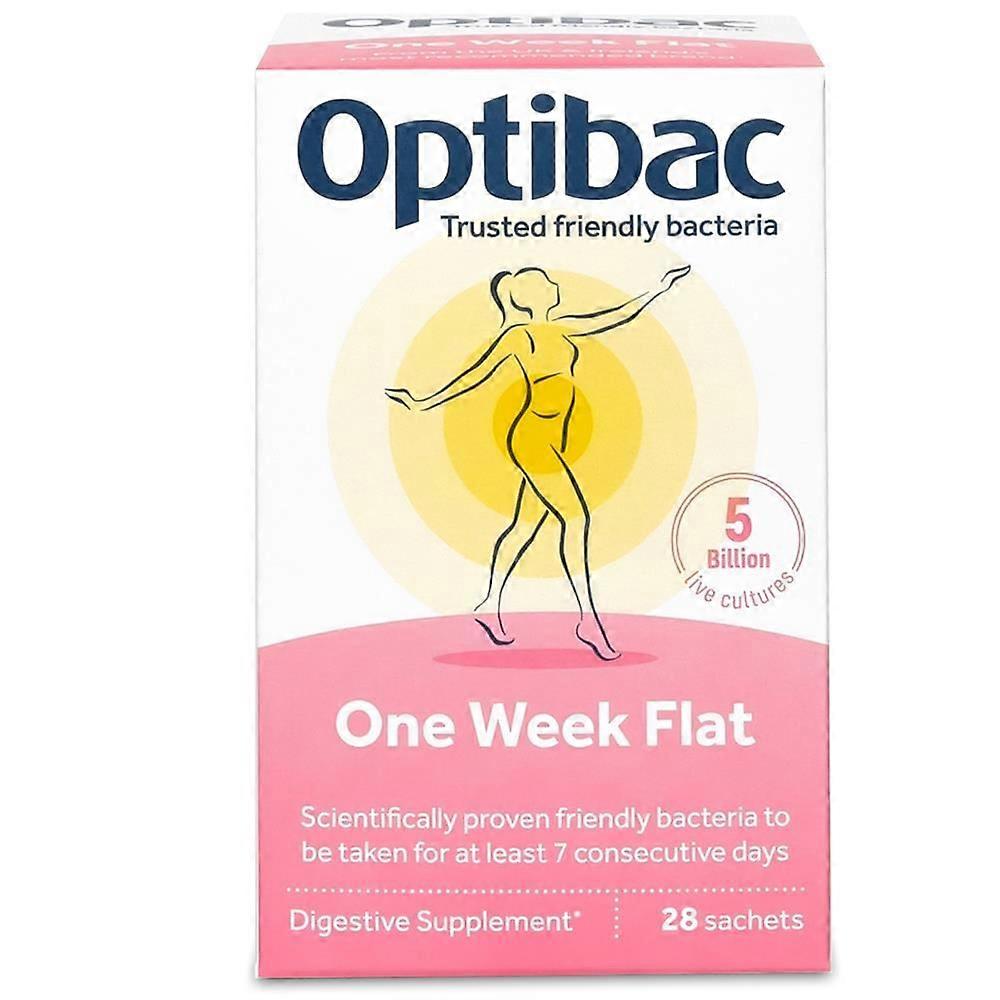 Optibac Probiotics One Week Flat offers a convenient and effective short-term course of beneficial bacteria, designed to support digestive comfort and reduce bloating. Each sachet delivers 5 billion live microorganisms, including the well-researched Lactobacillus casei Rosell-215, known for its ability to survive the journey through the digestive tract and reach the gut alive.This supplement is ideal for those seeking a targeted 7-day probiotic regimen. Its carefully selected strains have been scientifically documented to promote digestive balance and help alleviate occasional bloating. Thanks to advanced freeze-drying techniques, One Week Flat sachets do not require refrigeration, making them perfect for on-the-go use and travel. Contains 5 billion live microorganisms per sachet, guaranteed until the expiry date Includes the robust and clinically supported Lactobacillus casei Rosell-215 strain Gluten-free formula suitable for individuals with gluten sensitivities Convenient 7-day course with 28 sachets per pack for extended use or multiple courses No refrigeration needed due to advanced freeze-drying and naturally resilient strainsRecommended Use: Take one sachet daily, consecutively for 7 days, to support digestive health and comfort. Ideal for those experiencing occasional bloating or seeking a short-term probiotic boost.All Optibac Probiotics products are backed by extensive research and rigorous quality control, ensuring that you receive a high-quality probiotic supplement proven to reach your gut alive. Experience digestive wellbeing with the trusted expertise of Optibac Probiotics.