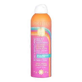 SEA & C Sheer Sunscreen Spray SPF 30 Our effective continuous, non-aerosol, water-resistant SPF 30 body spray sunscreen infuses skin care into sun care with supporting ingredients like Vitamin C and marine plant extracts. Our innovative formula is designed to apply sheer while integrating mineral protection. Water-resistant so you can stay outside and play while looking beautiful. For all skin types. DETAILS Suncare + skincare for your body Vanilla & orange natural scent Balanced formula designed to apply evenly Broad spectrum UVA/UVB protection Water-resistant up to 80 minutes Non-propellant continuous spray Continuous spray aluminum spray bottle HOW TO USE Uses: Helps prevent sunburn. If used as directed with other sun protection measures (see Directions), decreases the risk of skin cancer and early skin aging caused by the sun.Directions: Shake well. Apply liberally 15 minutes before sun exposure. Use a water resistant sunscreen if swimming or sweating. Reapply after swimming or sweating. Reapply at least every 2 hours.Warnings: For external use only. Contents under pressure. Do not puncture or incinerate. Do not store at temperatures above 120°F. For external use only. Do not use on damaged or broken skin. Stop use and ask a doctor if rash occurs. When using this product, keep out of eyes. Rinse with water to remove. Keep out of reach of children. If swallowed, get medical help or contact a Poison Control Center right away. INGREDIENTS Active Ingredients: Octisalate 4.9% • Octocrylene 7.6% • Zinc Oxide 7.0%Inactive ingredients: Aqua, Butyloctyl Salicylate, Caprylic/Capric Triglyceride, Acrylates Copolymer, Cetearyl Alcohol, Sodium Stearoyl Glutamate, Propanediol, Parfum (Natural), Tetrahexyldecyl Ascorbate (Vitamin C), Tocopherol (Vitamin E), Ascophyllum Nodosum Extract, Laminaria Digitata (Algae) Extract, Jojoba Esters, Caprylhydroxamic Acid, Caprylyl Glycol, Cellulose Gum, Citric Acid, Coco-Glucoside, Ethyl Ferulate, Glycerin, Glyceryl Stearate, Methyl Dihydroabietate, Microcrystalline Cellulose, Sodium Gluconate, Xanthan Gum.