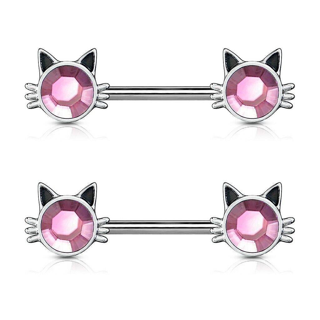 Pair of nipple barbell rings cat with pink stone set ends design surgical steel