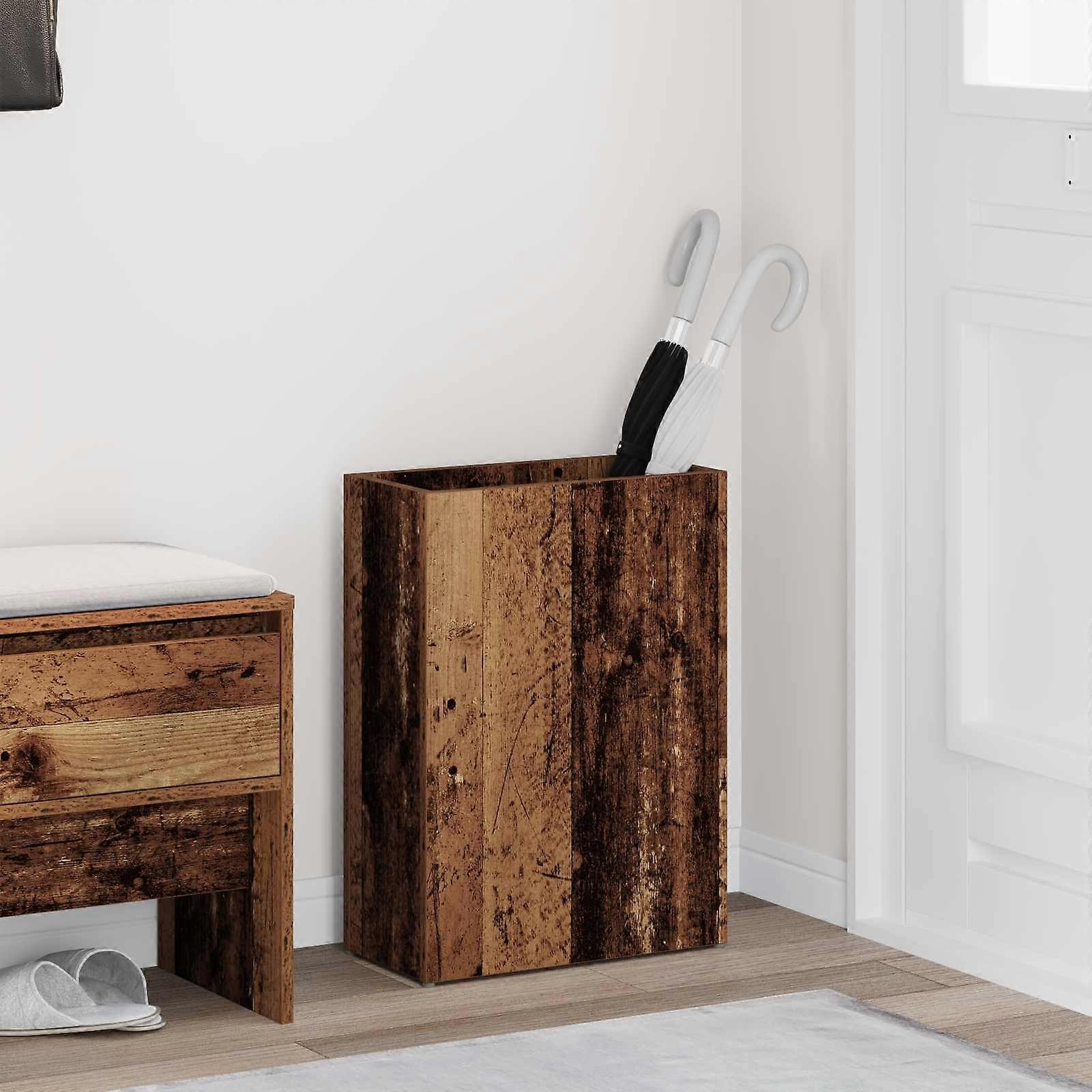 Dieser hölzerne Schirmständer vereint auf elegante Weise Funktionalität und Stil und ist somit eine unverzichtbare Ergänzung für Ihren Flur oder Ihre Diele. Er kombiniert modernes Design mit seiner glatten, rechteckigen Form und bietet Platz für Regenschirme und weitere Haushaltsgegenstände. Stellen Sie sich vor, wie dieser Ständer die Ästhetik Ihres Zuhauses aufwertet, indem seine schlanke Form mühelos moderne Innenräume ergänzt und gleichzeitig mit seinen effizienten Aufbewahrungsmöglichkeiten für Ordnung sorgt. Holzwerkstoffbau Dieser robuste Schirmständer ist aus Verbundholz gefertigt und gewährleistet eine langlebige und zuverlässige Nutzung, die dem täglichen Gebrauch standhält. Die Materialwahl sorgt für eine ansprechende Optik und Textur, die sich ideal in moderne Wohnräume einfügt. Rechteckige Form Mit seinem schlanken Design passt der Ständer perfekt in schmale Flure oder Garderoben. Die Form erleichtert das Platzieren an Wänden und macht ihn ideal für kleine Räume, ohne wertvollen Stauraum einzubüßen. Vielseitige Aufbewahrung Neben Regenschirmen bietet der Ständer Platz für Schals, Handschuhe und kleine Haushaltsartikel, was ihn zur optimalen Lösung für einen aufgeräumten Eingangsbereich macht. Leicht zu reinigende Oberfläche Dank seiner glatten Oberfläche, die sich schnell mit einem feuchten Tuch abwischen lässt, ist es einfach, das makellose Aussehen des Ständers zu erhalten. Vermeiden Sie aggressive Chemikalien oder schrubben Sie nicht, damit das elegante, saubere Aussehen auch bei täglichem Gebrauch erhalten bleibt. Funktioneller, moderner Stil Das minimalistische Design mit klaren Linien steigert die Ästhetik und bietet eine praktische Lösung, die Funktionalität und Eleganz harmonisch vereint – passend für jedes moderne Zuhause. Farbe: AltholzMaterial: HolzwerkstoffGesamtabmessungen: 40 x 20 x 55,5 cm (L x B x H)Gewicht: 7,6 kgLanglebigVielseitige AnwendungEinfache Reinigung der OberflächeRahmenmaterial: HolzwerkstoffMax. Gewicht: 40 kgNur für den InnenbereichLieferumfang:1 x RegenschirmständerMontage erforderlich: Ja