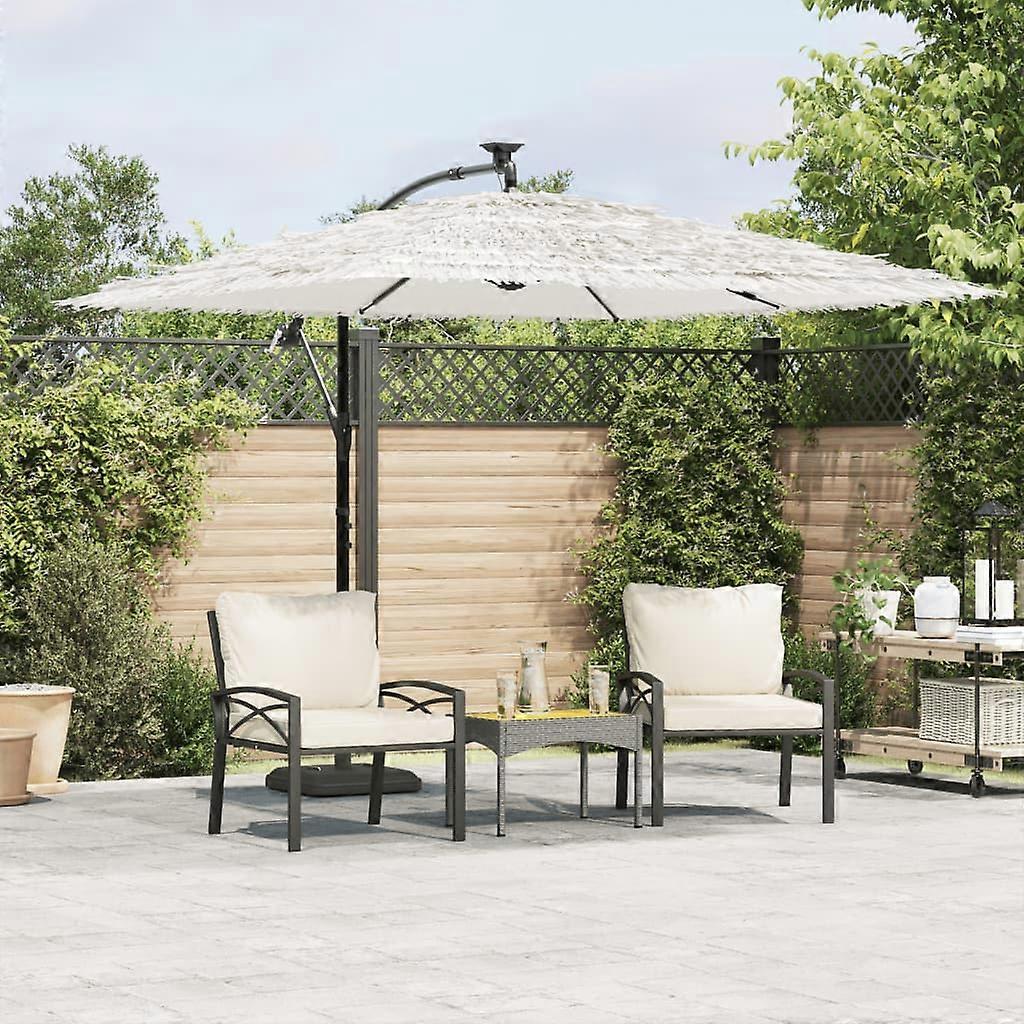 Dieser Sonnenschirm eignet sich perfekt, um Schatten zu spenden und dich vor den schädlichen UV-Strahlen der Sonne zu schützen. Schutz vor Sonne und Regen: Dieser Sonnenschirm aus strapazierfähigem Polyester bietet Schutz vor Sonne und Regen und ist ein idealer Ort, um den Outdoor-Bereich zu genießen. Robuste Konstruktion: Dieser Gartenschirm wird von einer robusten Stange und Rippen getragen, sodass er auch an windigen Tagen an Ort und Stelle bleibt. Kurbelmechanismus: Dank des Kurbelmechanismus lässt sich der Schirm leicht öffnen und schließen. Gut zu wissen:Dieses Produkt ist kein Spielzeug Achte darauf, dass Kinder weder den Balkonschirm noch den Bezug oder den Schirmständer zum Spielen oder Klettern benutzen. Offenes Feuer (z. B. Gartengrill oder Grill) unter oder direkt neben diesem Produkt vermeiden. Dieses Produkt ist nicht zu 100 % wasserdicht. Wir empfehlen daher, es mit einem Imprägnierspray zu behandeln, um eine bessere Wasserfestigkeit zu gewährleisten. Farbe: WeißMaterial: Stoff (100% Polyester), Stahl, StrohAbmessungen: 269 x 269 x 235 cm (L x B x H)Mastdurchmesser: 48 mmGröße Kreuzständer: 100 x 100 cm (L x B)Mit dem KurbelsystemMit 6-lagigem StrohdachZusammenbau erforderlich: Ja