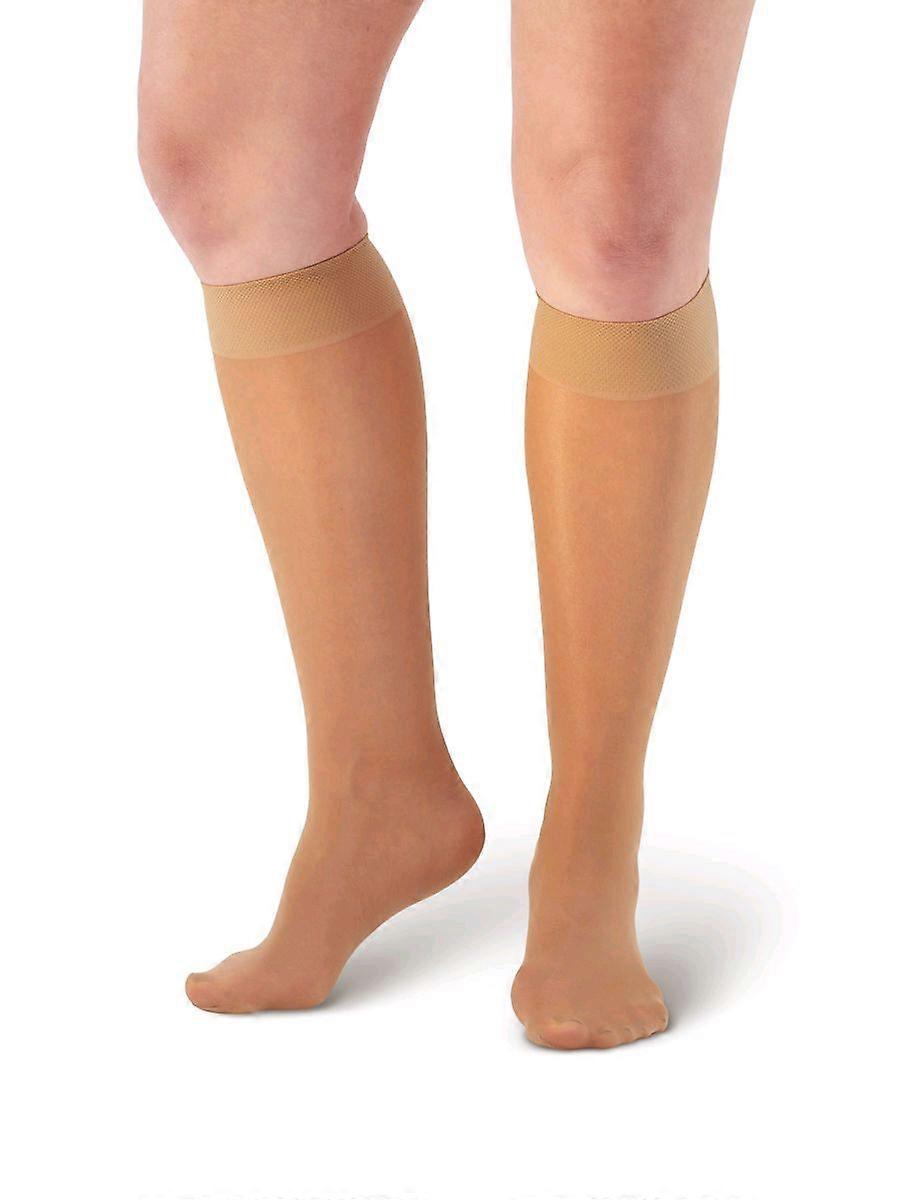 Our lightest support socks are ideal for those requiring support hosiery as a preventative measure of spider & varicose veins, slight swelling & leg fatigue. If you are a person on your feet all day, then use these lovely ladies sheer support knee highs to help keep your legs feeling energised. These can be used as Flight Socks for people who show no current symptoms of circulatory problems, to prevent leg fatigue and minor swelling, both common symptoms when travelling. The low compression level make these easier to get into, which is perfect for those who may struggle to get into support socks with higher compressions due to Athritis (in the hands), for example. Features a non-restrictive top band in a stocking foot design (no reciprocated heel and toe area). Mild to moderate compression (8-15 mmHg) 88% Nylon/12% Lycra Stocking Foot Design Non-restrictive Top Band
