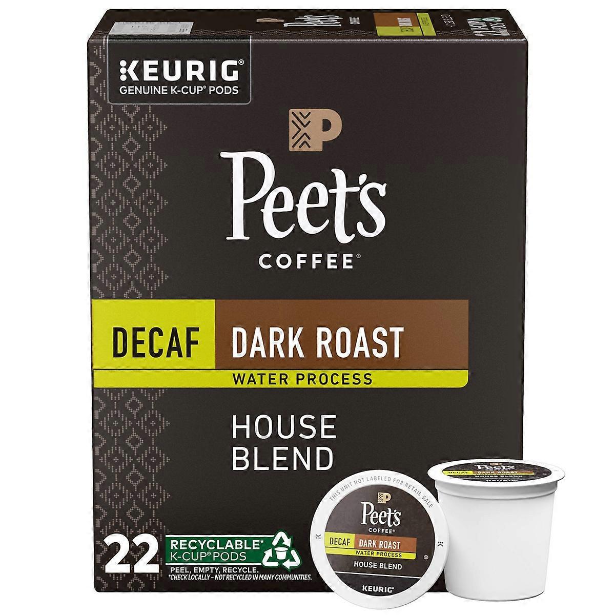 Contains one (1) Box of 22 Peet's Decaf House Dark Roast Decaffeinated Coffee K-Cup Pods - 100% Arabica Coffee. Flavor and Roast: Dark Roast Decaf. Smooth, satisfying, sweet. The perfect introduction to our signature style -- strictly high-grown, finest quality, and deeply roasted to maximize flavor. Brewing Methods: Peet's single serve, K-Cup Pods are compatible with all Keurig K-Cup Brewers. Decaf Done Differently: Every Peet’s decaf is naturally water processed to remove caffeine—not flavor—before meticulous roasting. And by using the same high-quality coffee beans, you get a decaf that tastes as good as the real thing. Sourcing with Impact: The coffee you buy can impact the welfare of the people and planet. Peet’s is actively engaged in driving positive impact in communities where our coffees are grown.