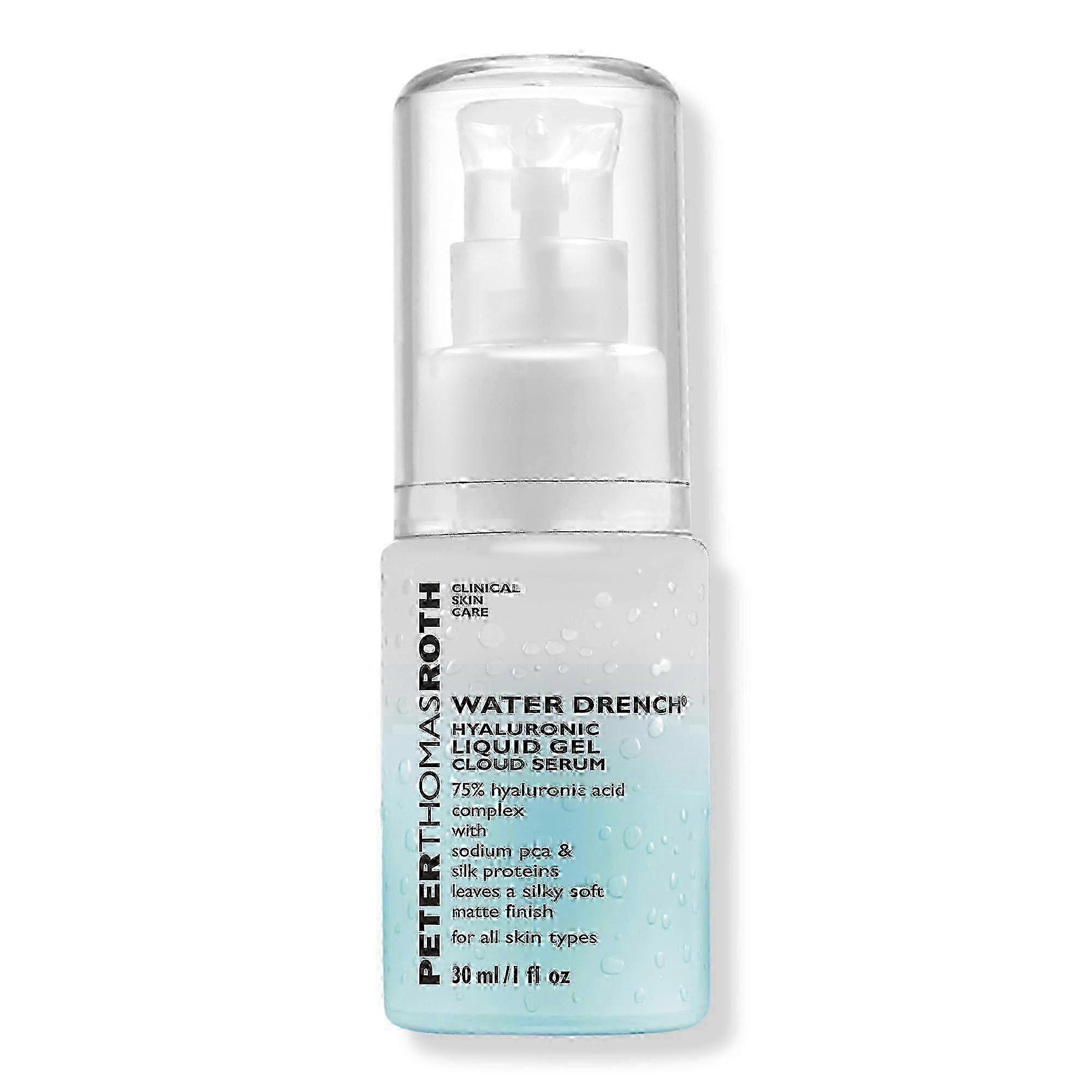 Peter Thomas Roth Water Drench Hyaluronic Liquid Gel Cloud Serum is a clear gel serum with a 75% Hyaluronic Acid Complex that drenches skin with lightweight moisture for a silky soft, matte finish.