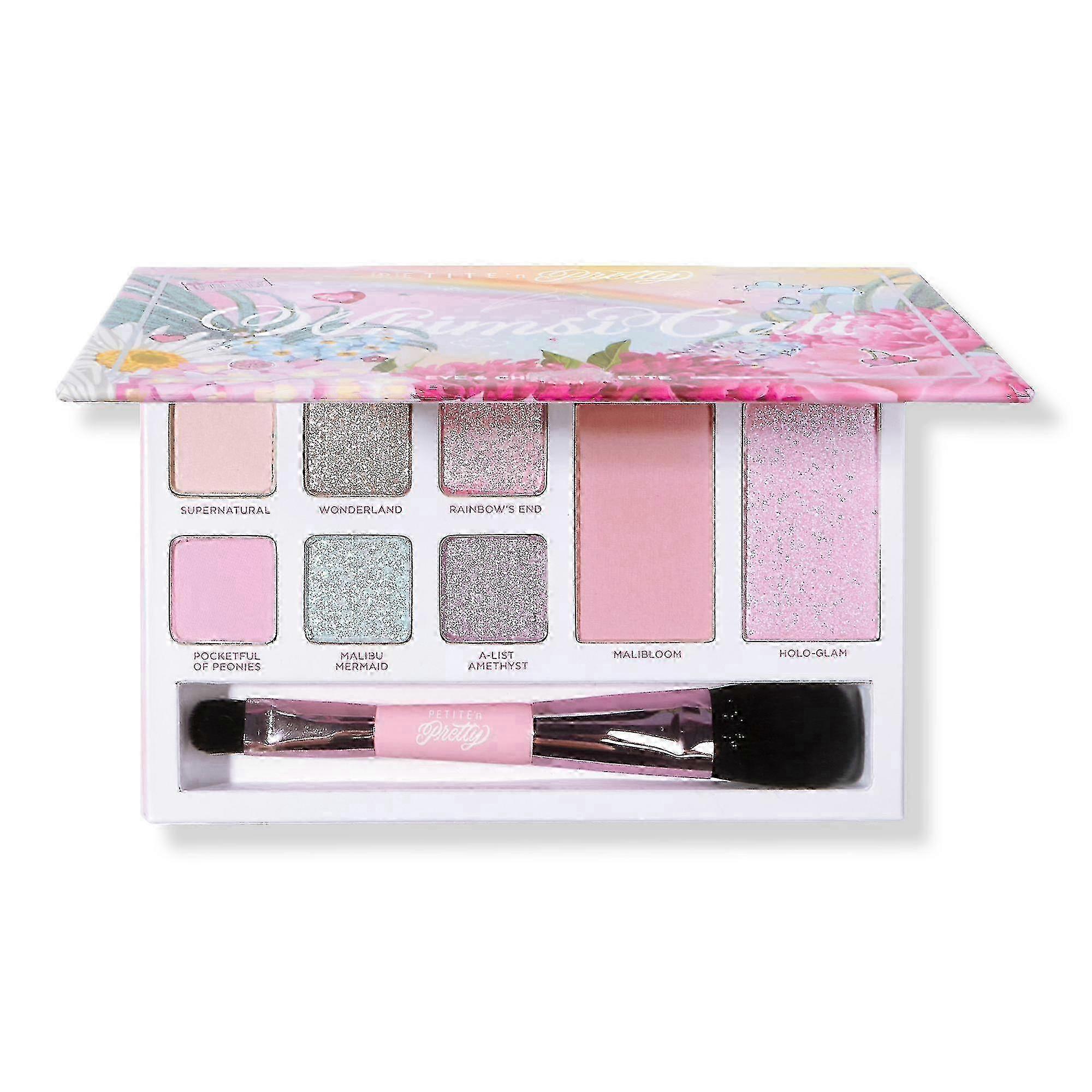Petite 'n Pretty's WhimsiCali Eye & Cheek Palette is a wonderland of rose-garden pinks and crystalline violets, all fit for a fairytale ending.Benefits: Richly pigmented powders give mega-wow sparkle, light-catching luminosity, and a silky-smooth payoff Dual-ended artistry brush custom-sized for petite features Pediatrician, ophthalmologist, and dermatologist approved Shades: A-List Amethyst Wonderland Rainbow's End Supernatural Malibu Mermaid Malibloom Blush Highlighter Holo-Glam Formulated Without: Nuts Gluten Talc Parabens Phthalates Active Ingredients: Eyeshadow A-List Amethyst: Mica, Caprylic/Capric Triglyceride, Dimethicone, Synthetic Fluorphlogopite, Calcium Aluminum Borosilicate, Zinc Stearate, Calcium Sodium Borosilicate, Sodium Dehydroacetate, Phenoxyethanol, Sorbic Acid, Tin Oxide, Boron Nitride, Silica. Titanium Dioxide (CI 77891), Carmine (CI 75470), Ferric Ferrocyanide (CI 77510). *Contains Carmine as a color additive. Wonderland: Mica, Caprylic/Capric Triglyceride, Dimethicone, Synthetic Fluorphlogopite, Calcium Aluminum Borosilicate, Zinc Stearate, Sodium Dehydroacetate, Phenoxyethanol, Sorbic Acid, Silica, Tin Oxide, Boron Nitride. May Contain: Titanium Dioxide (CI 77891), Iron Oxides (CI 77491), Copper Powder (CI 77400), Ultramarines (CI 77007), Carmine (CI 75470), Ferric Ferrocyanide (CI 77510). *Contains Carmine as a color additive. Rainbow's End: Synthetic Fluorphlogopite, Mica, Caprylic/Capric Triglyceride, Dimethicone, Zinc Stearate, Calcium Aluminum Borosilicate, Sodium Dehydroacetate, Sorbic Acid, Maltodextrin, Phenoxyethanol, Tin Oxide, Boron Nitride, Silica. May Contain: Titanium Dioxide (CI 77891), Carmine (CI 75470), Ultramarines (CI 77007). *Contains Carmine as a color additive. Supernatural: Mica, Boron Nitride, Zinc Stearate, Caprylic/Capric Triglyceride, Dimethicone, Sodium Dehydroacetate, Phenoxyethanol, Sorbic Acid, Maltodextrin. May Contain: Manganese Violet (CI 77742), Iron Oxides (CI 77491, CI 77492, CI 77499), Titanium Dioxide (CI 77891), Carmine (CI 75470).*Contains Carmine as a color additive. Malibu Mermaid: Mica, Calcium Aluminum Borosilicate, Caprylic/Capric Triglyceride, Dimethicone, Synthetic Fluorphlogopite, Zinc Stearate, Sodium Dehydroacetate, Tin Oxide, Phenoxyethanol, Sorbic Acid, Boron Nitride. May Contain: Titanium Dioxide (CI 77891), Ferric Ferrocyanide (CI 77510). Pocketful of Peonies: Mica, Polyethylene, Boron Nitride, Caprylic/Capric Triglyceride, Dimethicone, Sodium Dehydroacetate, Phenoxyethanol, Sorbic Acid, Silica. May Contain: Titanium Dioxide (CI 77891), Manganese Violet (CI 77742), Ultramarines (CI 77007), Carmine (CI 75470). *Contains Carmine as a color additive. Blush (Not intended for use around the eye). Malibloom: Mica, Boron Nitride, Zinc Stearate, Caprylic/Capric Triglyceride, Dimethicone, Sodium Dehydroacetate, Phenoxyethanol, Sorbic Acid, Maltodextrin. May Contain: Titanium Dioxide (CI 77891), Manganese Violet (CI 77742), Ultramarines (CI 77007), Carmine (CI 75470), Red 28 Lake (CI 45410), Yellow 5 Lake (CI 19140). *Contains Carmine as a color additive. Highlighter Holo-Glam: Mica, Caprylic/Capric Triglyceride, Synthetic Fluorphlogopite, Calcium Aluminum Borosilicate, Zinc Stearate, Dimethicone, Silica, Sodium Dehydroacetate, Phenoxyethanol, Tin Oxide, Sorbic Acid, Boron Nitride. May Contain: Titanium Dioxide (CI 77891), Carmine (CI 75470). *Contains Carmine as a color additive.