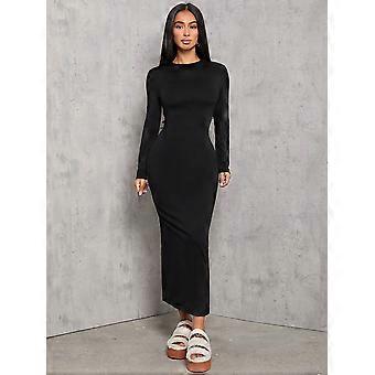 PETITE Solid Color Pleated Waist Black Long Sleeve Dress