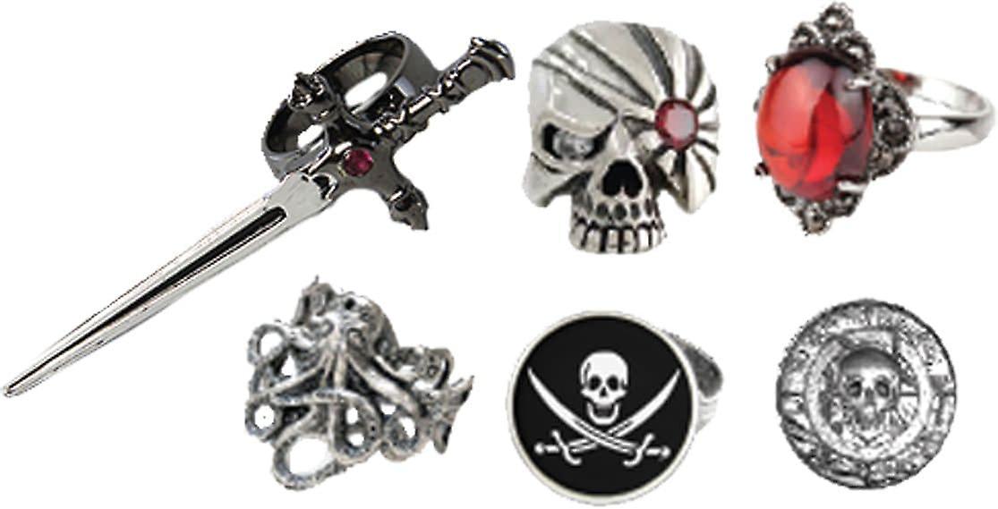 Set Includes Six Different Ring Styles: Octopus, Dagger With Red Jewel, Pirate Skull With Red Jewel Eye Patch, Skull And Cross Bones, Pirate Coin And Embellished Large Red Stone.