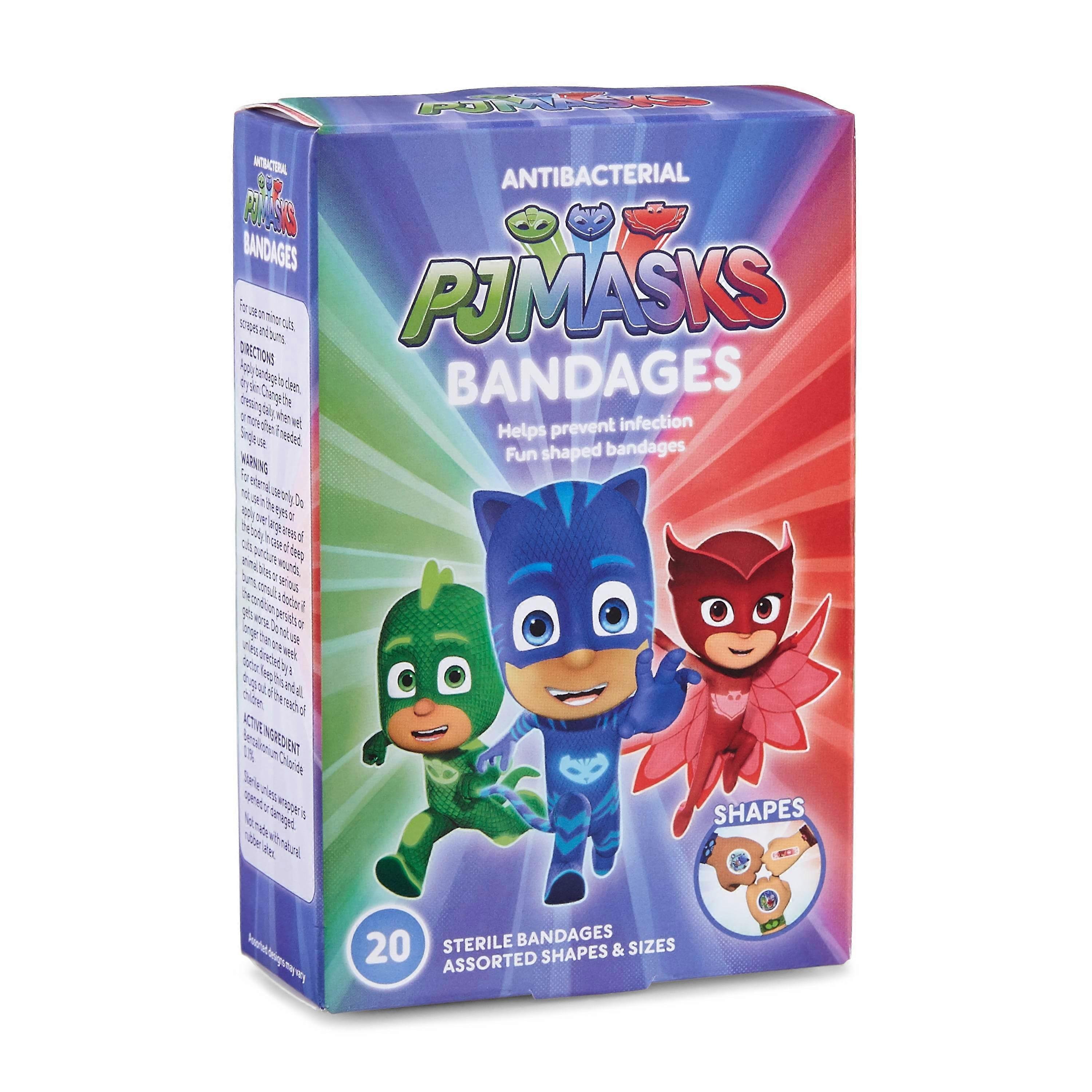 Treat minor bumps and scrapes with every kid's favorite afterhours superheroes, the PJ Masks. This box of PJ Masks Kids Antibacterial Bandages features favorite characters Catboy, Owlette, and Gekko from the animated television show PJ Masks on versatile strip and round bandages. Each kids bandage has a non-stick pad designed to kill bacteria and help prevent infection while providing comfy cushioning to protect cuts, scratches, blisters, burns, and scrapes. This package contains 20 sterile first-aid bandages designed to stick to hands, feet, knees, elbows, fingers, toes, and more. Each bandage features long-lasting, sure-stick adhesive so PJ Masks Kids Antibacterial Bandages stay put even on busy, active kids. These fun and colorful superhero bandages can help boys and girls dry their tears and get right back to the action. They are great to have at home, in the car, or as an essential a part of your well-stocked first aid kit. Includes 20 sterile first-aid bandages Includes ten 3/4" x 3" and 5/8" x 2-1/4" plastic strips, and ten 1.45" dia. round spot bandages For use on minor cuts, scrapes, and burns Antibacterial non-stick pad kills bacteria to help prevent infection Cushions and protects wounds Long-lasting adhesive helps bandages stay in place Flexible plastic design Includes a variety of designs with favorite PJ Masks characters Apply to clean, dry skin for best results Active antibacterial ingredient Benzalkonium Chloride 0.1% Not made with natural rubber latex