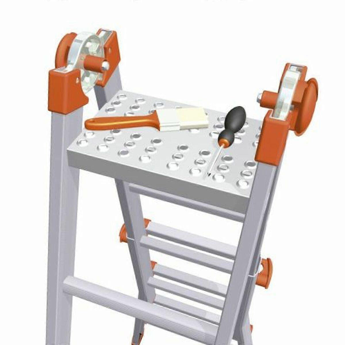 The storage platform from the GIERRE brand is an accessory designed to enhance the functionality and safety of telescopic ladders, specifically compatible with the Peppina EN131 and 125 kg models, both in aluminum and mixed versions. Made in Italy, this platform provides an additional area to place tools, materials, or work equipment comfortably and securely during tasks at height. Its silver structure combines strength and durability, designed to support loads in compliance with the EN131 safety standard, with a recommended maximum capacity of 125 kg. The platform offers a wide and stable space that facilitates temporary storage, optimizing worker efficiency by reducing movement and improving organization at the workplace. Additionally, its design includes specific elements to securely attach to Peppina telescopic ladders, ensuring the necessary stability for work in various environments, whether industrial, professional, or domestic. Manufactured following European regulations, it reflects quality and reliability, suitable for users who need a practical and robust solution for temporary storage while using ladders. In short, this platform is an essential complement for those looking to improve the functionality and safety of their telescopic ladders with a proven quality European product.
