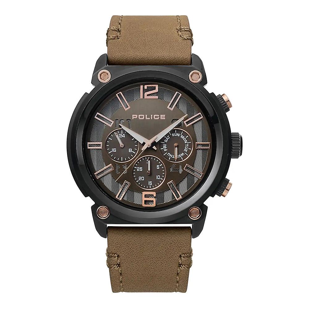 Police Armor PL.14378JSB/11 Mens Watch Multifunctional Stainless steel case, black coating, mat Leather strap, brown, pin buckle Quartz movement, battery operated Weekday display, Date display, 24 hour display 5 ATM Water Resistant Dial color black / gold Case width around 50 mm Case height around 11 mm Comes with booklet and box.