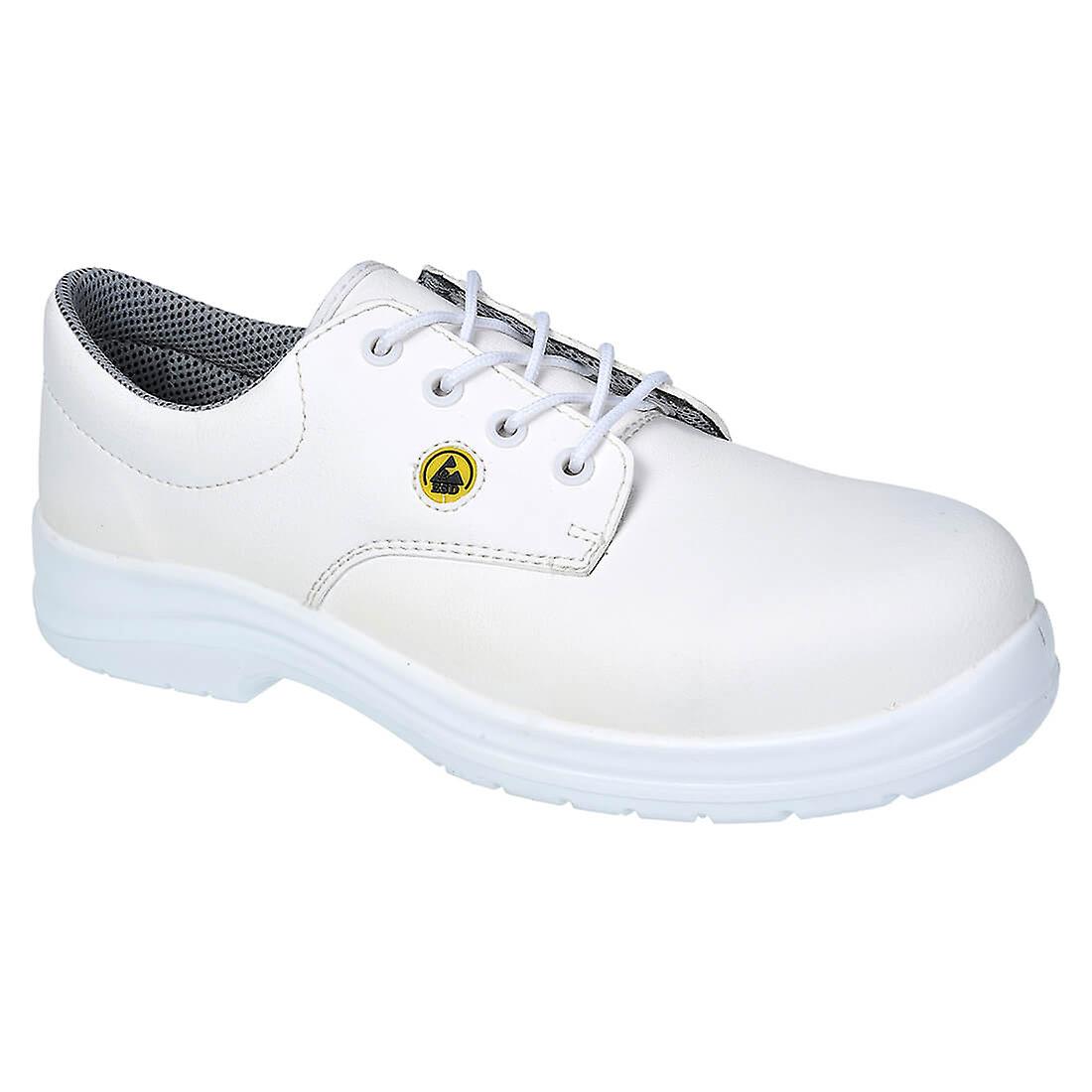 Classic laced safety shoe with microfibre upper and dual density outsole. 100% non metallic. Suitable for use in ESD environments. Complies with EN 61340-5-1.Features Padded collar for added comfort Water resistant upper to prevent water penetration Suitable for use in ESD environments 100% non-metallic Anti-static footwear Energy Absorbing Seat Region Composite toecap for added protection SRC - Slip resistant outsole to prevent slips and trips on ceramic and steel surfaces Fuel and oil resistant outsole Dual density sole unit CE certified UKCA marked Certifications EN ISO 20345 S2 EN 61340-4-3 Material Composition Upper: Microfibre Outsole: PU/PU We deliver Portwest FC01 Compositelite ESD Laced Work Shoes S2 worldwide.We specialise in shipping almost anywhere in the world securely at competitive prices - across UK, US, Canada, Ireland, New Zealand, Europe - securely and fast at competitive prices