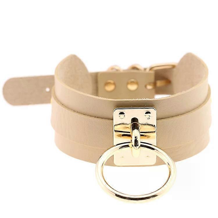PU Leather Choker Necklace-Gold O-Ring,Wide Harajuku Style,Khaki Khaki