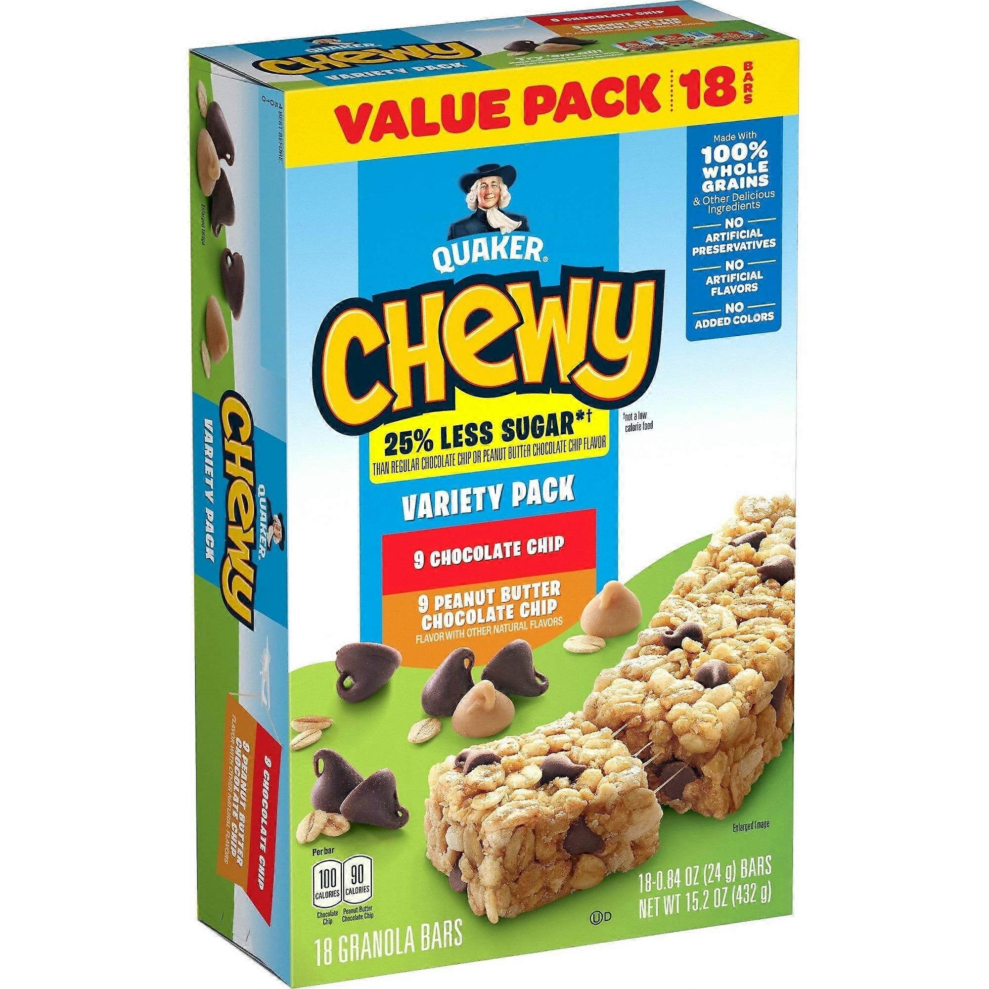 Satisfy your snack cravings and help fuel your day with Quaker Chewy 25% less sugar* Granola Bars Variety Pack. With 8 grams of whole grains and 25% less sugar* than regular Chewy bars, you can feel good about serving this snack to the whole family. Each box comes with eight individually wrapped bars that are made without high-fructose corn syrup. You'll enjoy Chocolate Chip, Peanut Butter, and Cookies and Cream flavors. UPC: 030000450109 Weight: 1.32 lbs RKU: TAR53141965
