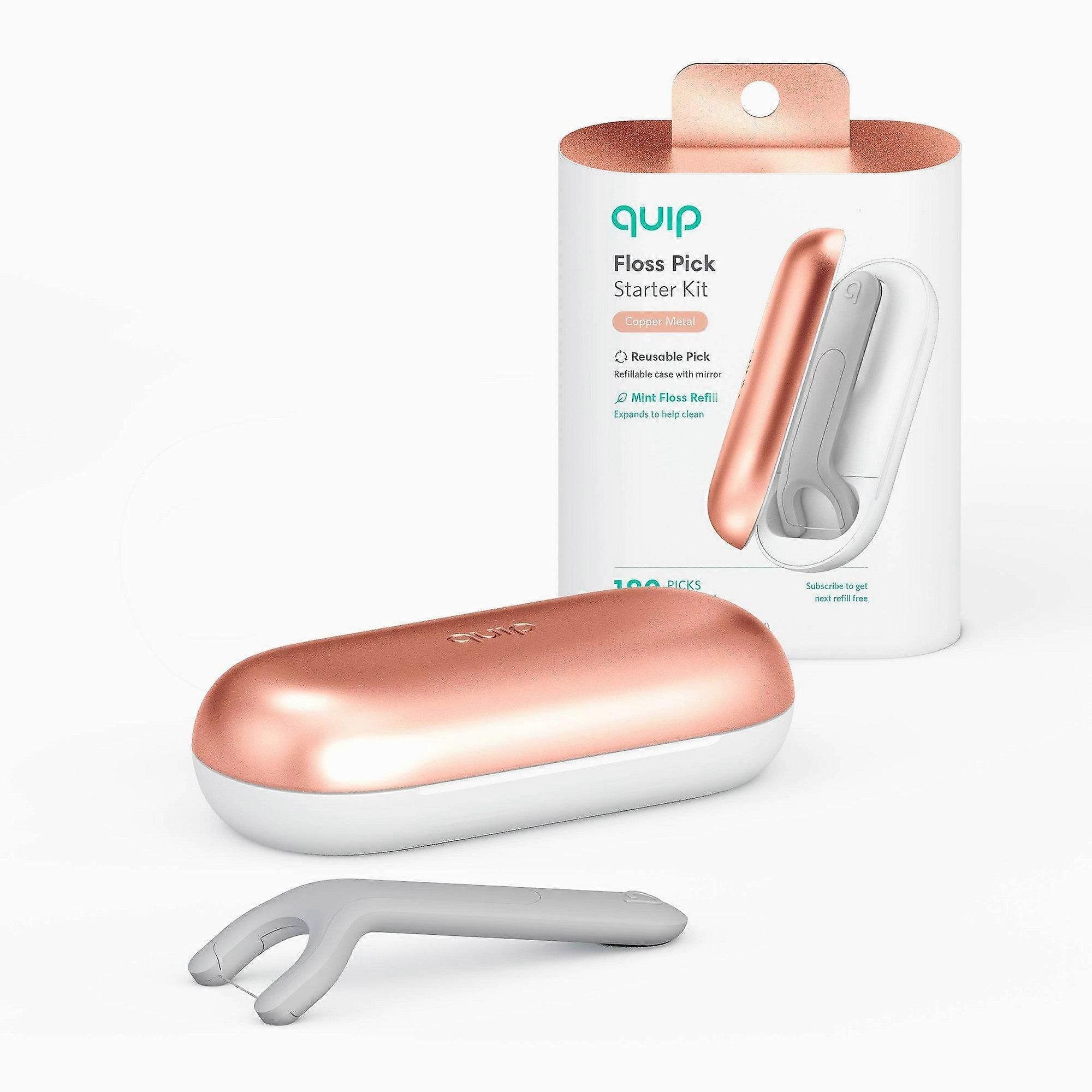Pick a better, more eco-friendly floss pick. The quip Floss Pick Starter Kit makes it simple and sustainable with an easy-to-string floss pick you keep for life, a mirrored dispensing case, and a preloaded floss refill you change every 3 months. Made from 100% recyclable paper, each floss refill replaces 180 single-use, disposable plastic picks and helps reduce plastic waste. Simply open the dispenser, press the "q" button to cut a fresh piece of string, then comfortably guide the reusuable rubber-grip floss pick into all those hard-to-reach places. Waxed polyester string expands to clean between teeth and has a natural mint flavor for a cool, refreshing routine. The slim, travel-ready design easily packs into any pocket, purse, or bag for on the go, and is available in premium metal and plastic dispenser colors worth displaying on any bathroom counter. It’s an amazing value, just as affordable as other leading floss brands, and a 3-month supply when used as directed (7.6 YD / 7M). Like most quip oral care products, the quip Floss Pick is American Dental Association Accepted, and shown to help remove plaque and prevent gingivitis between teeth.