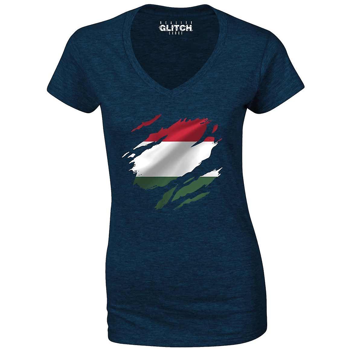 Reality Glitch Torn Hungary Flag Womens T-shirt - V-neck