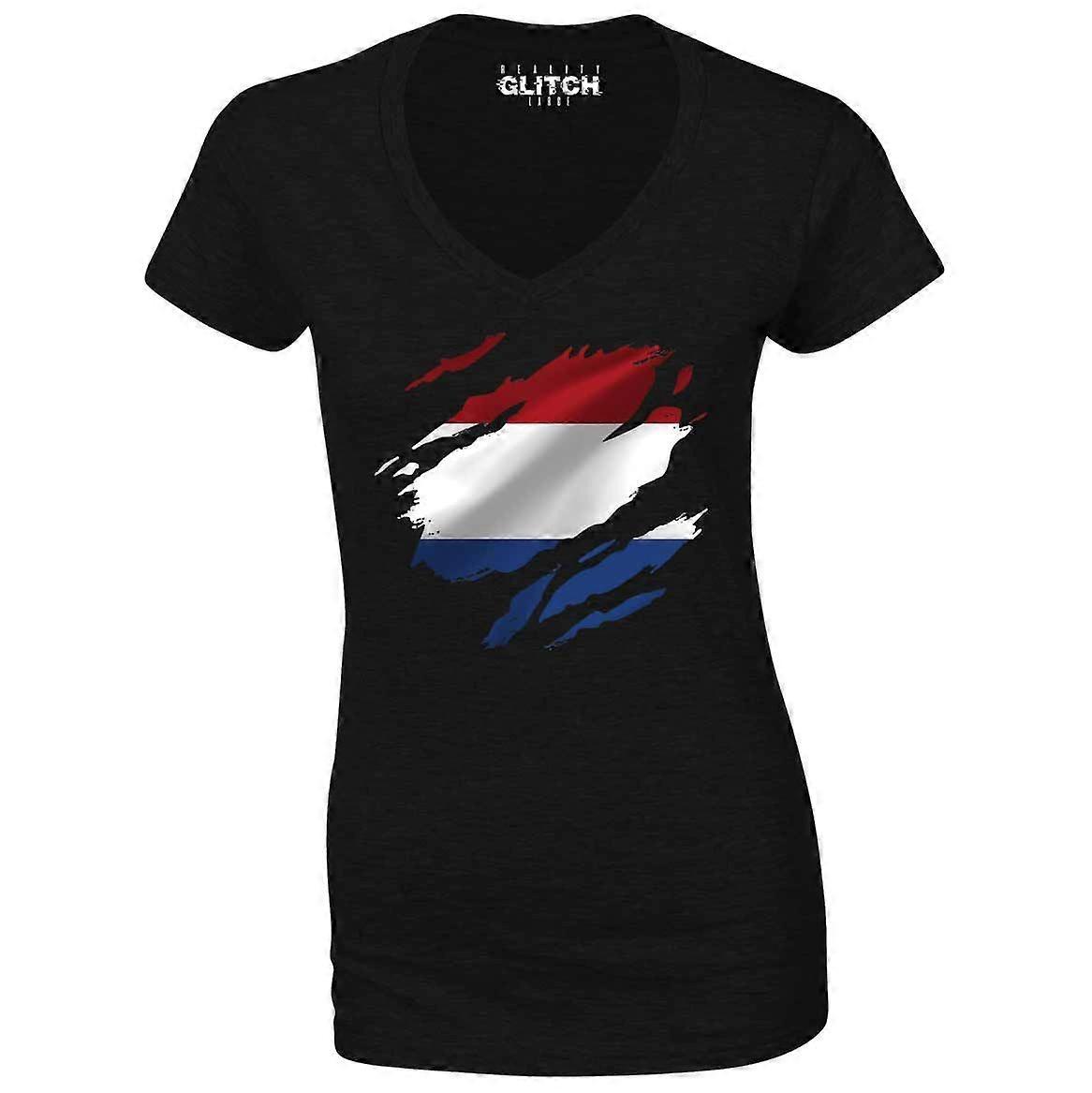 Reality Glitch Torn Netherlands Flag Womens T-shirt - V-neck