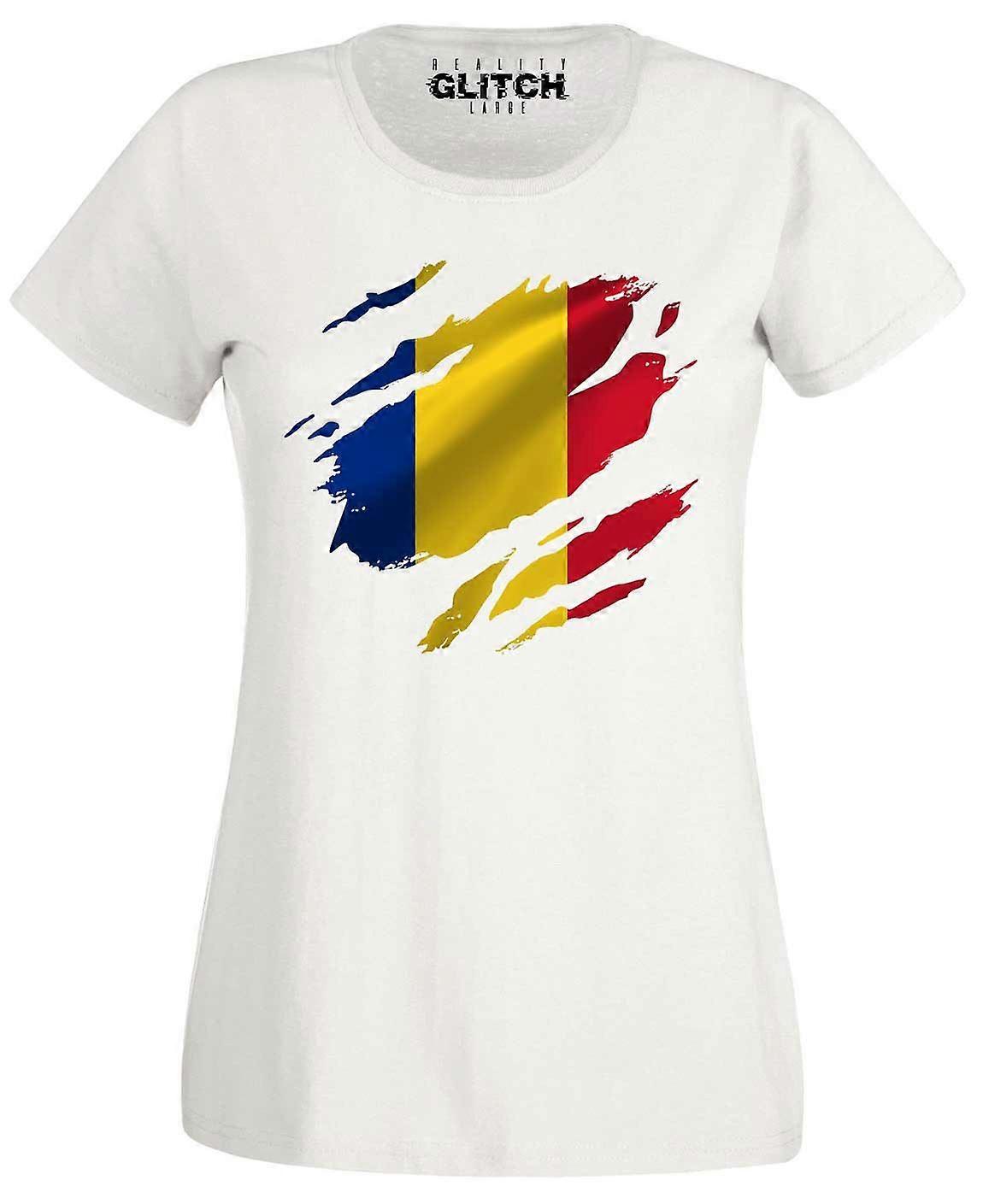 Reality Glitch Torn Romania Flag Womens T-shirt