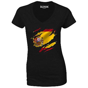 Reality Glitch Torn Spain Flag Womens T-shirt - V-neck