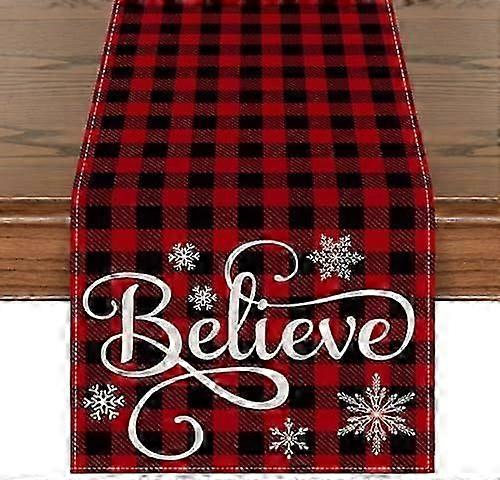 Red and Black Buffalo Plaid Believe Table Runner, Seasonal Winter Christmas Holiday Kitchen Dining Table Decoration for Indoor Outdoor Home Party Deco