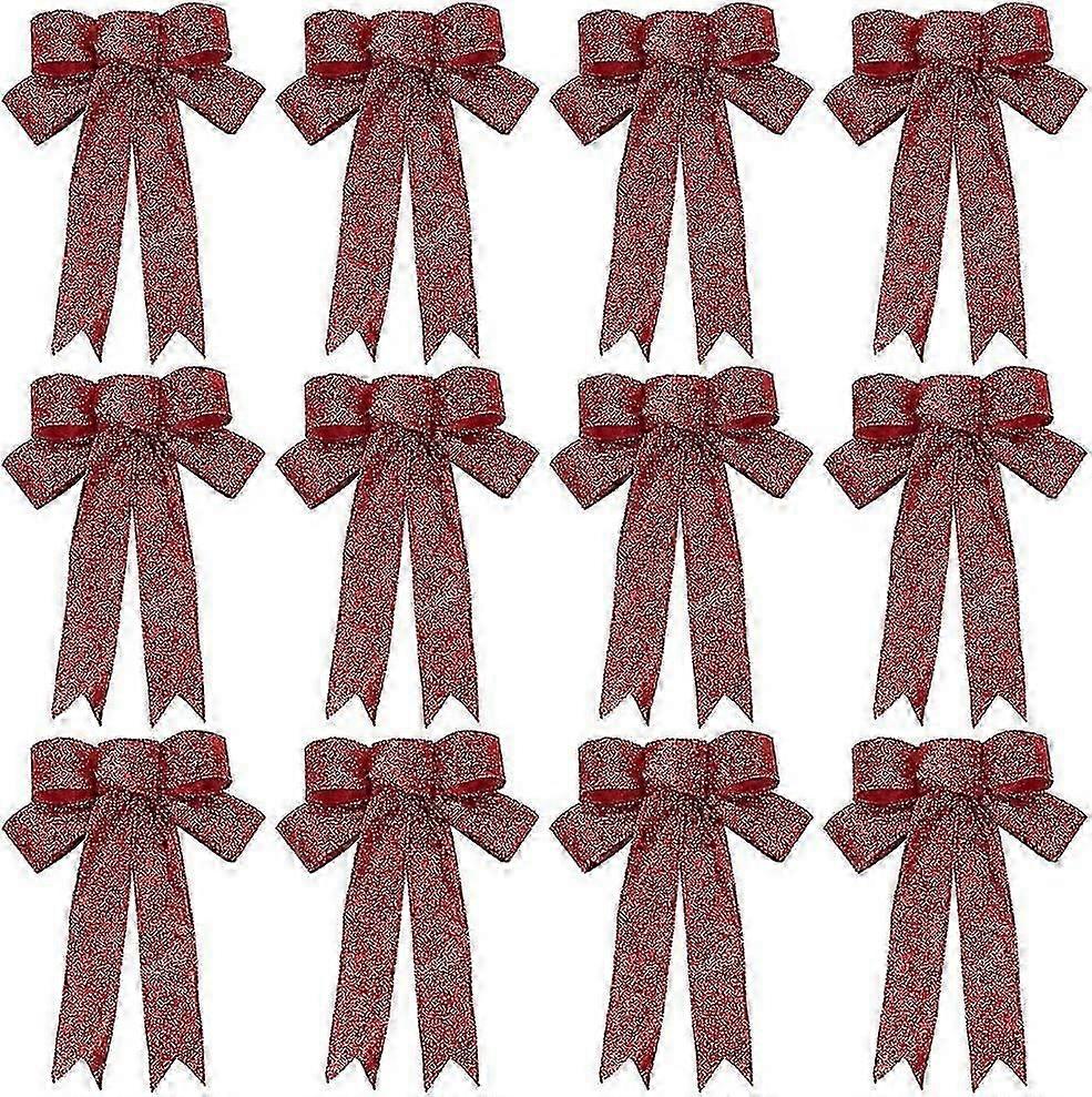 Novelty design: When you receive the goods, it is the ribbonwrapped, thecan form beautiful flowers, suitable for indoor and outdoor decoration, tight enough to prevent the structure from unraveling^Quality Material: These Christmas bows are made with shimmering ribbons that hold their shapes, which will sparkle in the night; Size: 9 x 7 inches, can be attached to Christmas trees, windows and boxes^Package includes: The package comes with 12 Christmas bows, enough for you to decorate your home, make your home full of Christmas atmosphere, give your family a happy Christmas^Versatile Festival Decoration: You can attach the Christmas bows to your Christmas wreaths, windows, trees, stairs, walls, doors, fences and more other places to add more color and beauty to your Christmas party and create a warm and soft feeling^Wide Usage: Bows can be applied to Christmas tree, stair handrail, windows, wreaths, branches, etc., create Christmas atmosphere and show your holiday spirit^