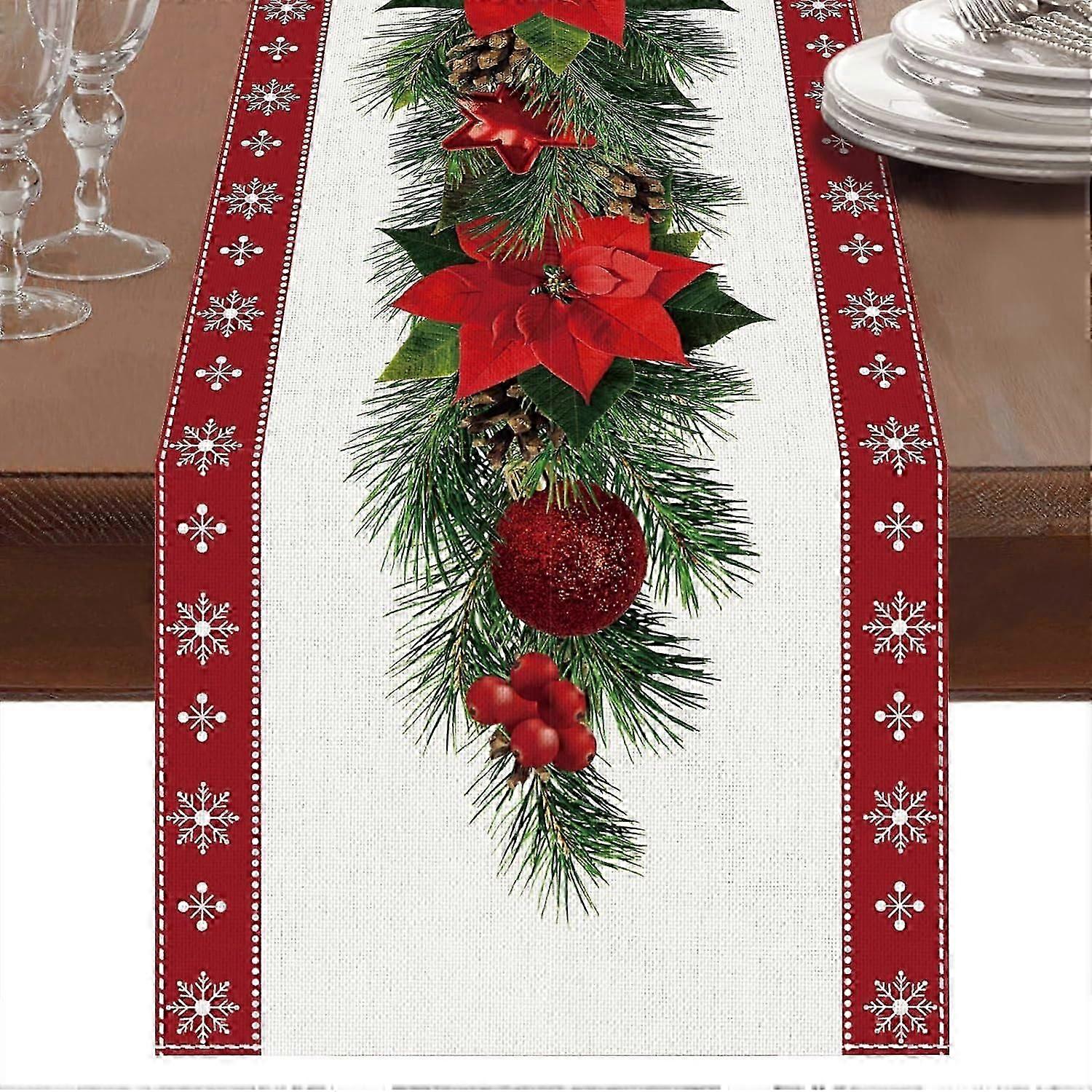 Red Christmas table runner with watercolor and white snowflakes, seasonal winter holiday party decoration, 13 x 72 inches